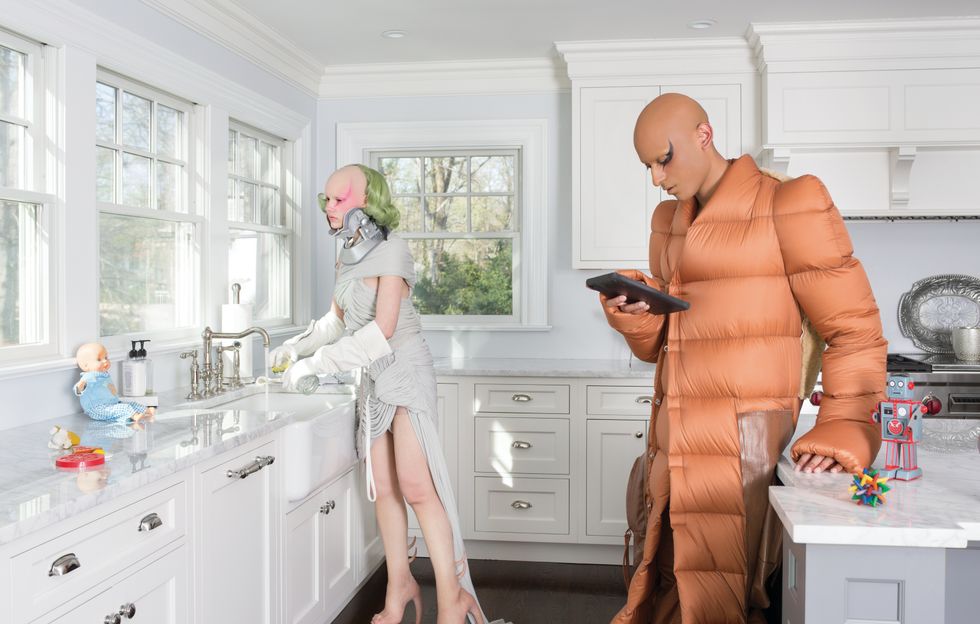 (On Hannah) Clothing & Boots: Fecal Matter, Necklace: Vintage Screaming Mimi's (On Steven) Coat: Valentino, Gloves & Boots: Rick Owens, Headpiece: Fecal Matter