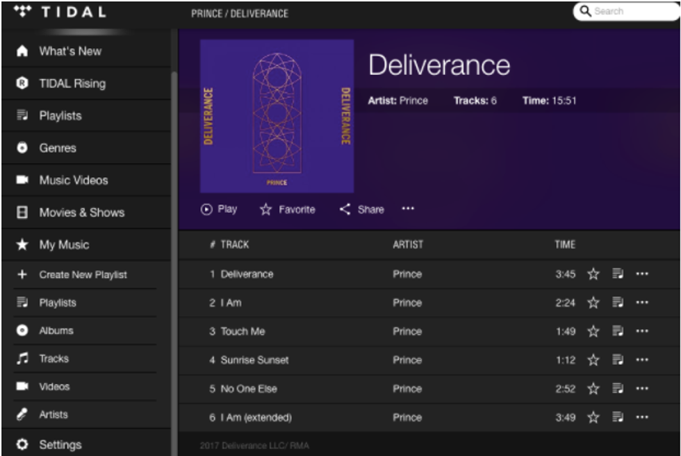 One year to the day after Prince's untimely death, and despite an order by a judge blocking its release, Prince's previously unreleased EP Deliverance has leaked. The album is also available for streaming on Tidal. Roc Nation and Tidal have been in a legal battle with Prince's estate since late last year.