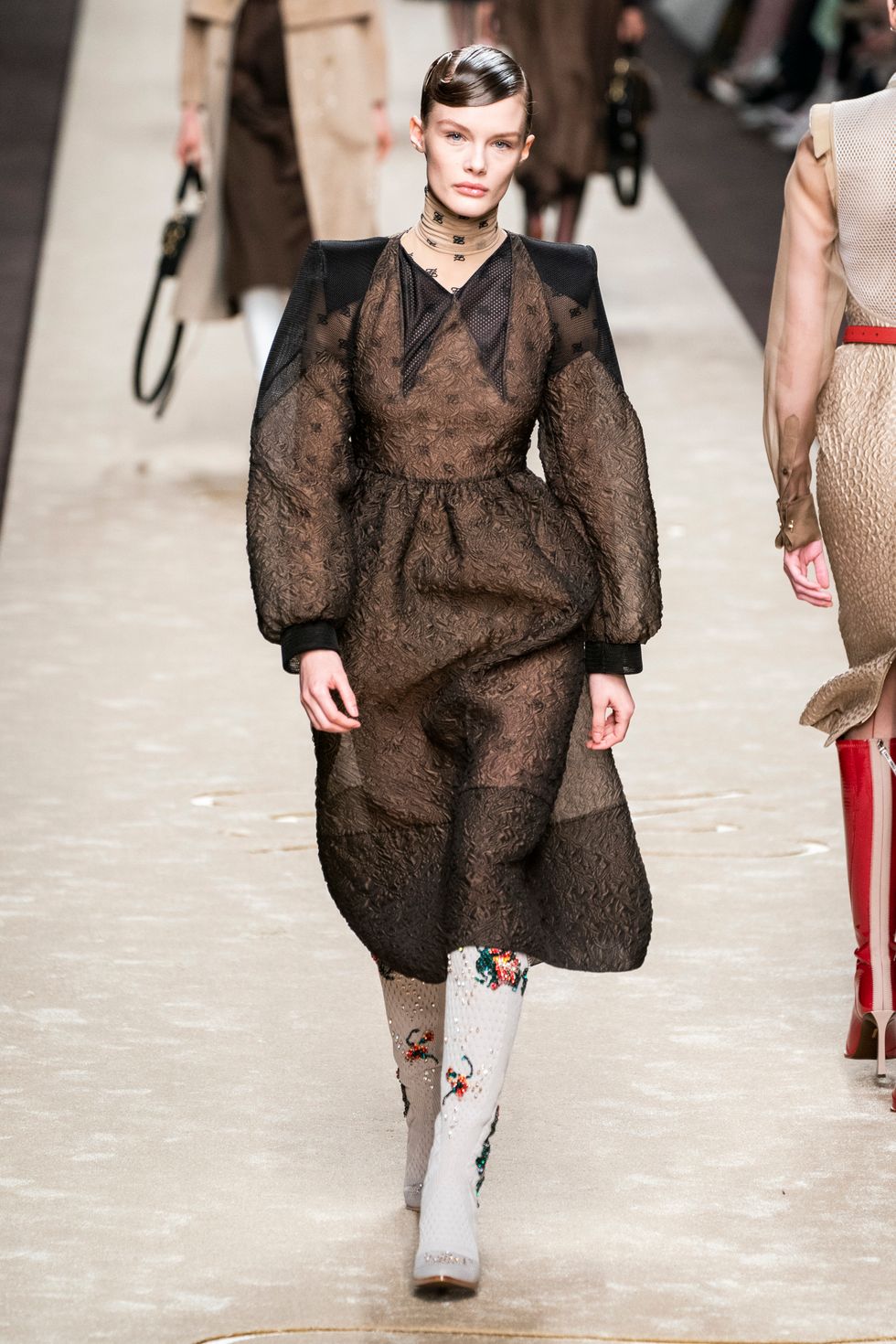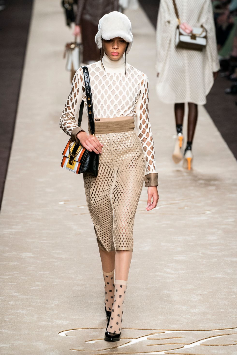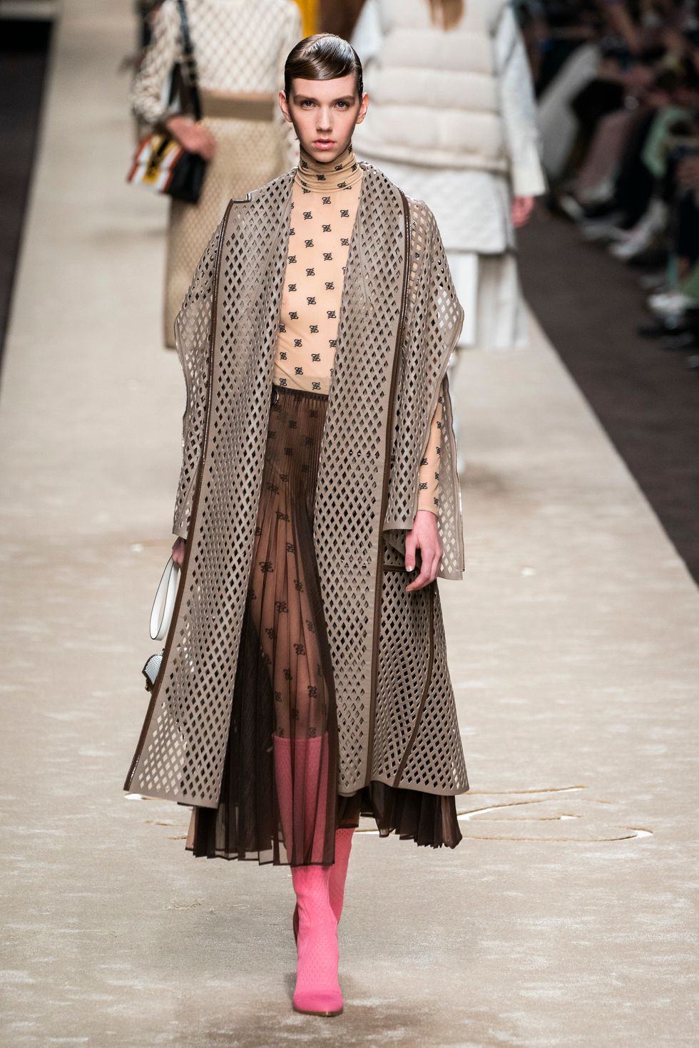 Lagerfeld designed the 'Karligraphy' FF logo for Fendi nearly 40 years ago – and it still remains a signature of the brand. At the show, it was seen on buttons, sheer tights, lightweight turtlenecks, and gossamer thin blouses.