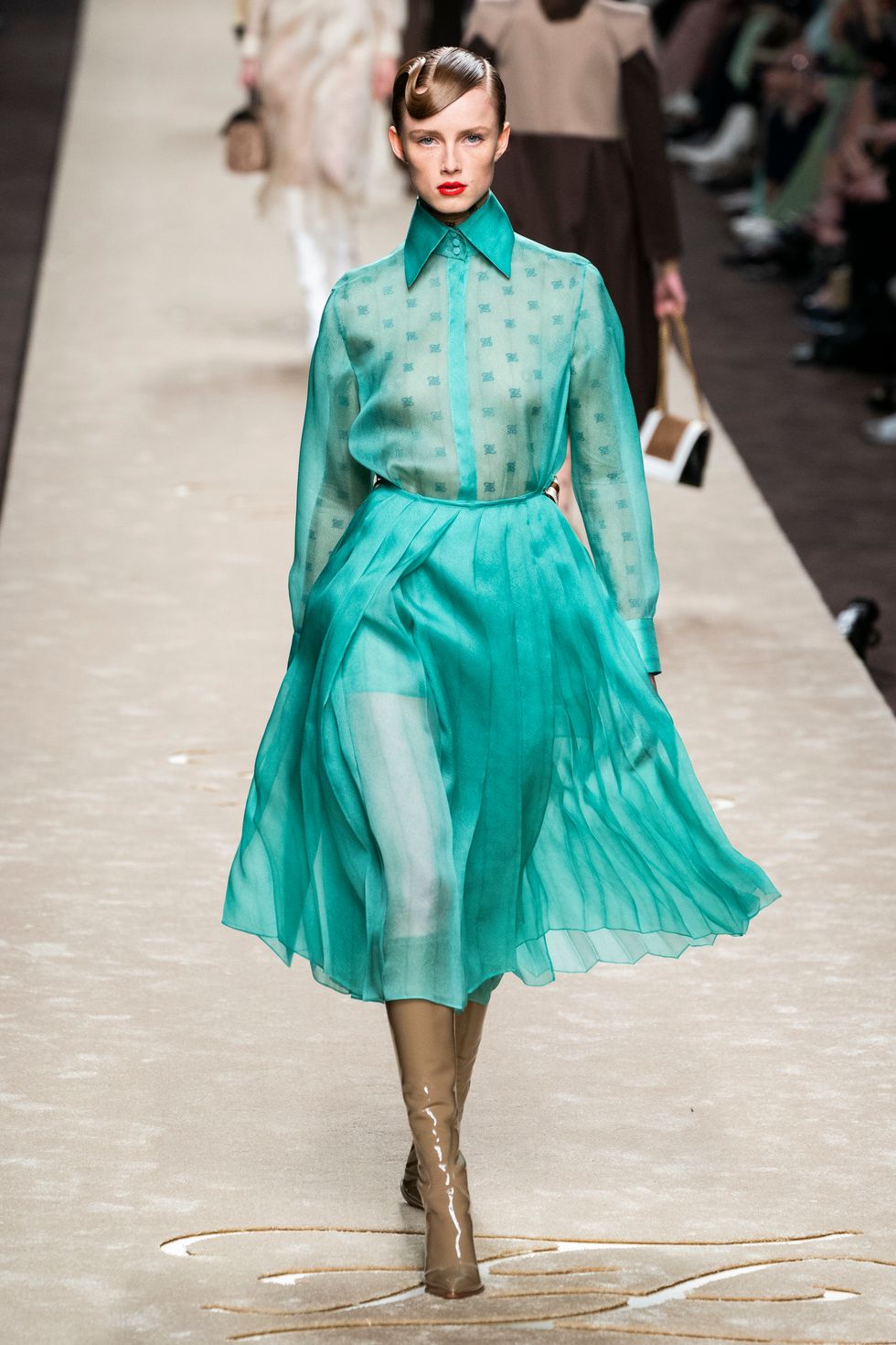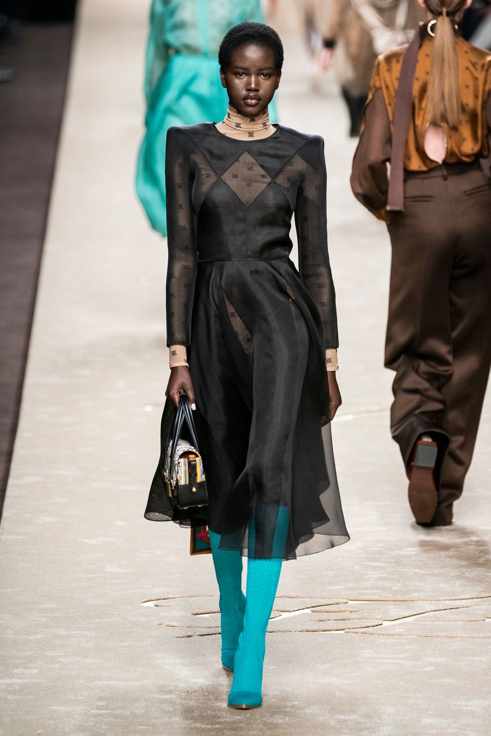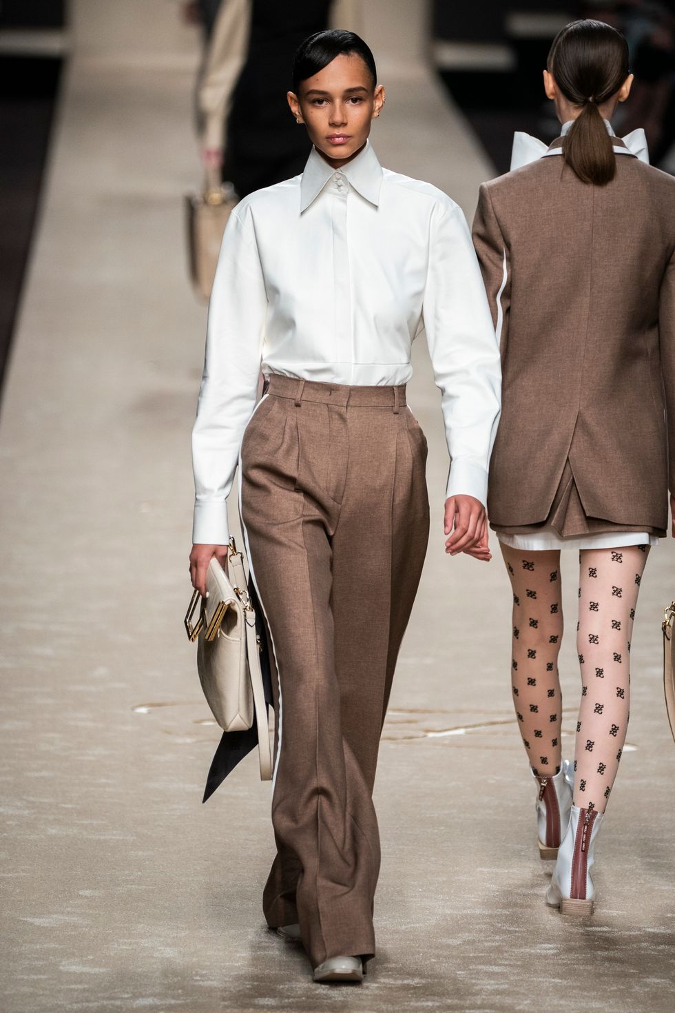 Lagerfeld designed the 'Karligraphy' FF logo for Fendi nearly 40 years ago – and it still remains a signature of the brand. At the show, it was seen on buttons, sheer tights, lightweight turtlenecks, and gossamer thin blouses.