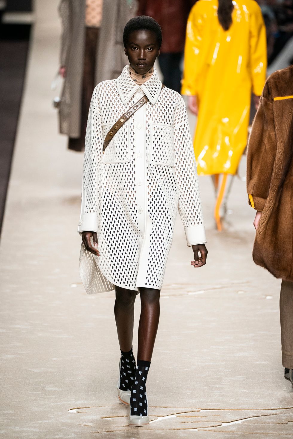 The most interesting texture within the collection were the pieces made of laser cut leather. A sunny yellow coat featured the technique on the pockets, white shirt dresses were constructed out of it as well as long coats and skirts.