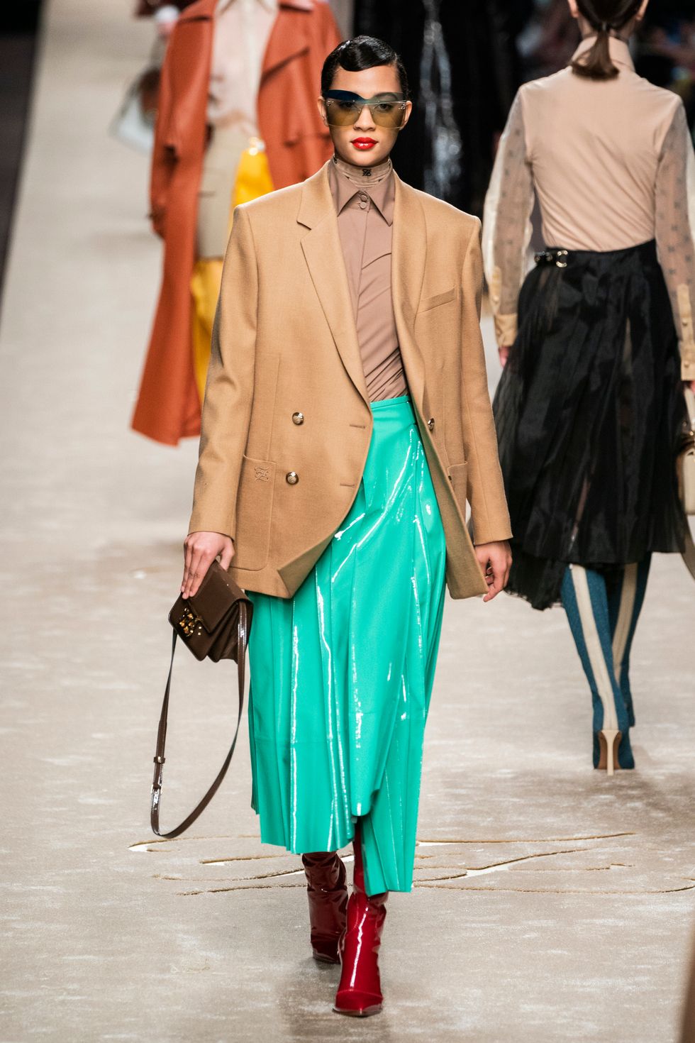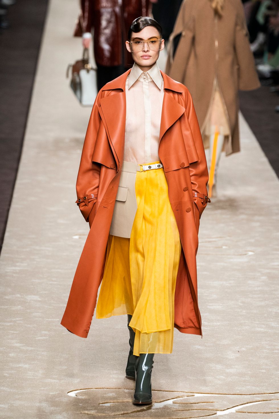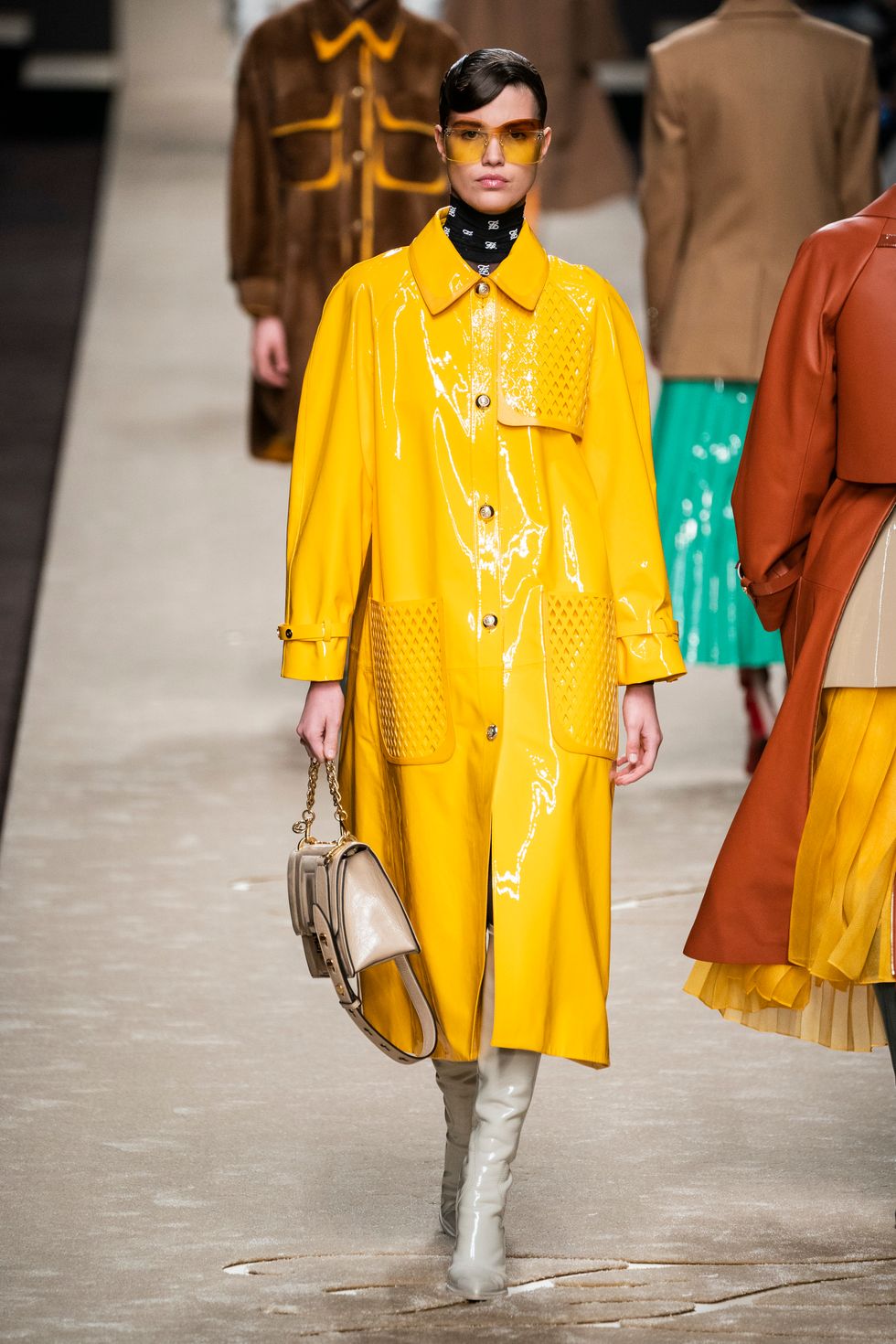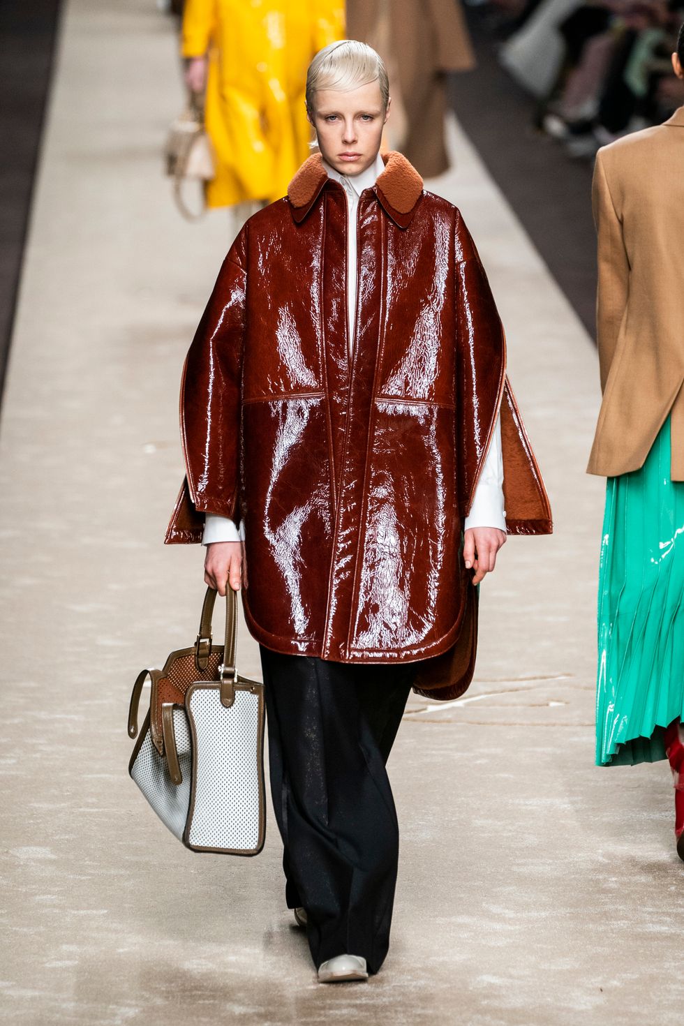 Patent struck out as the most statement-making texture when it came to leathers. Plenty of patent boots were shown as well as a glossy shearling jackets in yellow and maroon, a vibrant green patent skirt — plus shiny bags.