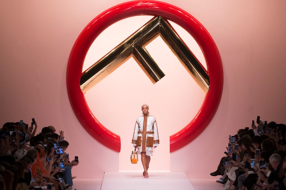 Subtlety isn't in Fendi's vocabulary. Before the show began, a crowd that included Nicki Minaj (covered head-to-toe in artist Hey Reilly's Fendi x Fila collaboration) were greeted by an enormous circular F logo door plastered against a millennial pink wall. It was a literal sign of things to come as Bella and Gigi Hadid, Kendall Jenner, Kaia Gerber, Adesuwa, and Sara Grace Wallerstedt followed show opener Adwoa Abdoah onto the runway in a range of looks covered in the Fendi's signature insignia.