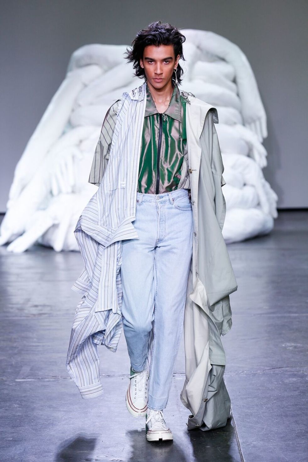 "I guess this is my way of processing life," Feng Chen Wang says regarding the design process backstage at her spring 2019 show. "I'm always trying to answer personal questions." At present, Wang is attempting to figure out who or what her other half is. While the Chinese designer has yet to find the answer, she's managed to make the query physically manifest in her most recent collection.