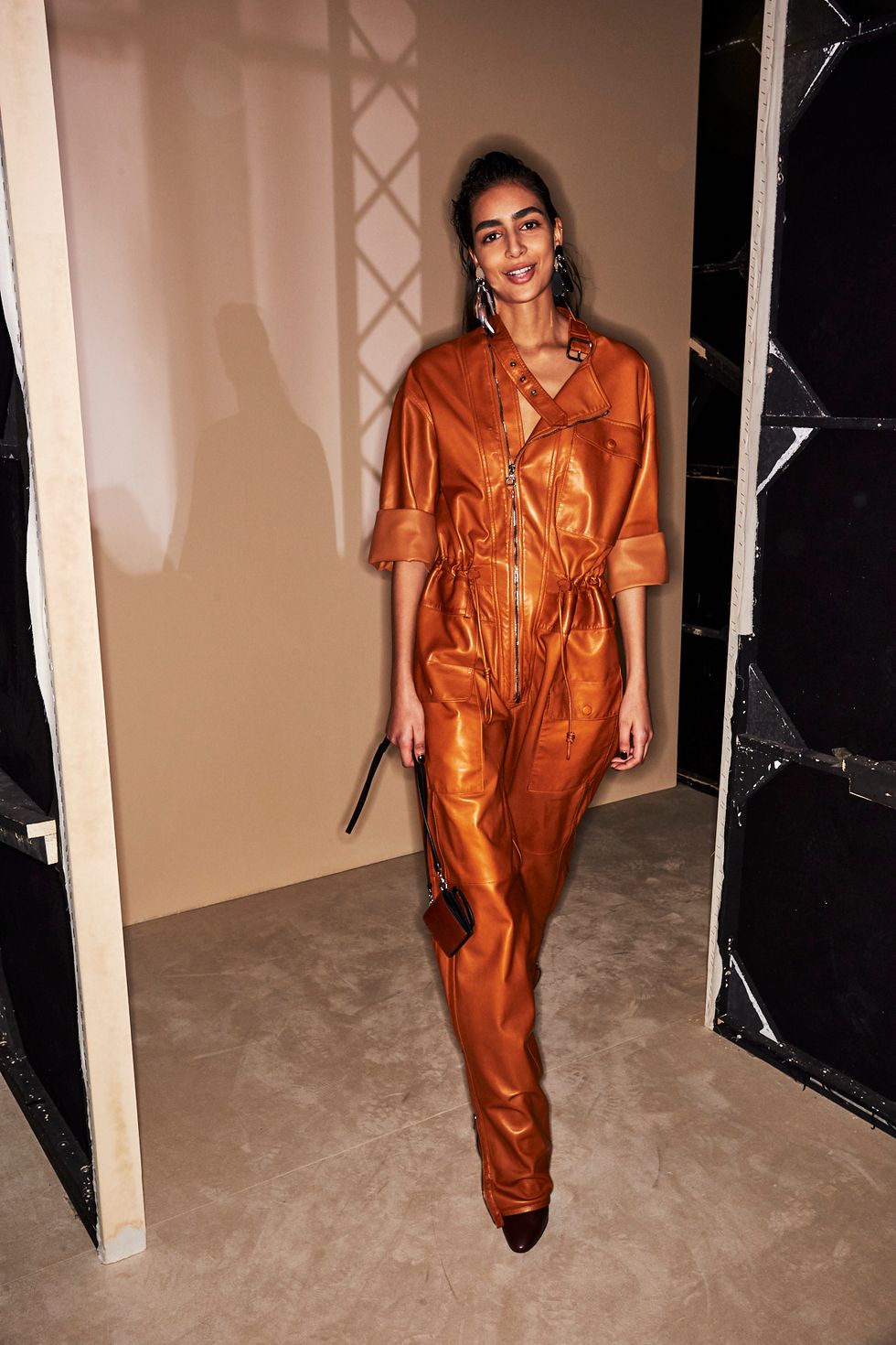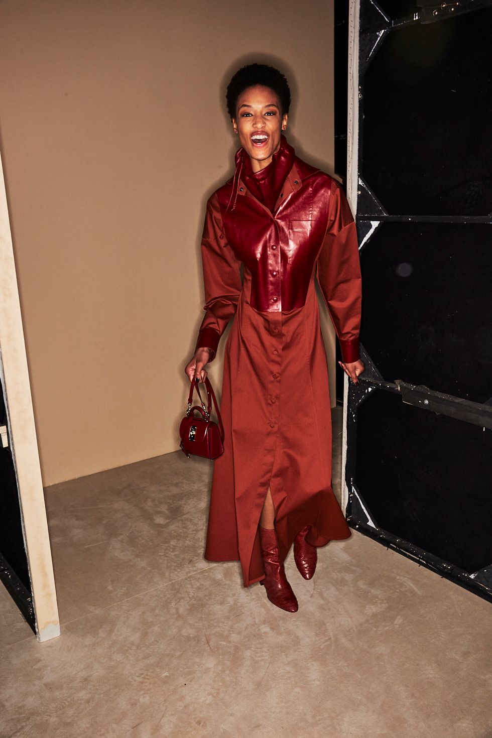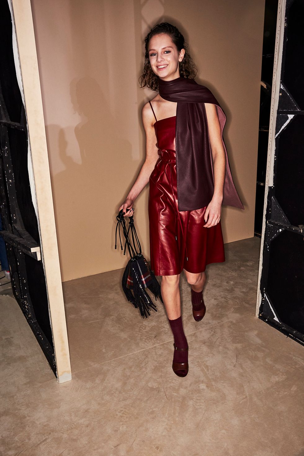 We saw the return of the slinky slip dress here. In blue, sea foam green and red and chocolate leather, each one added a '90s cool aesthetic to the collection.