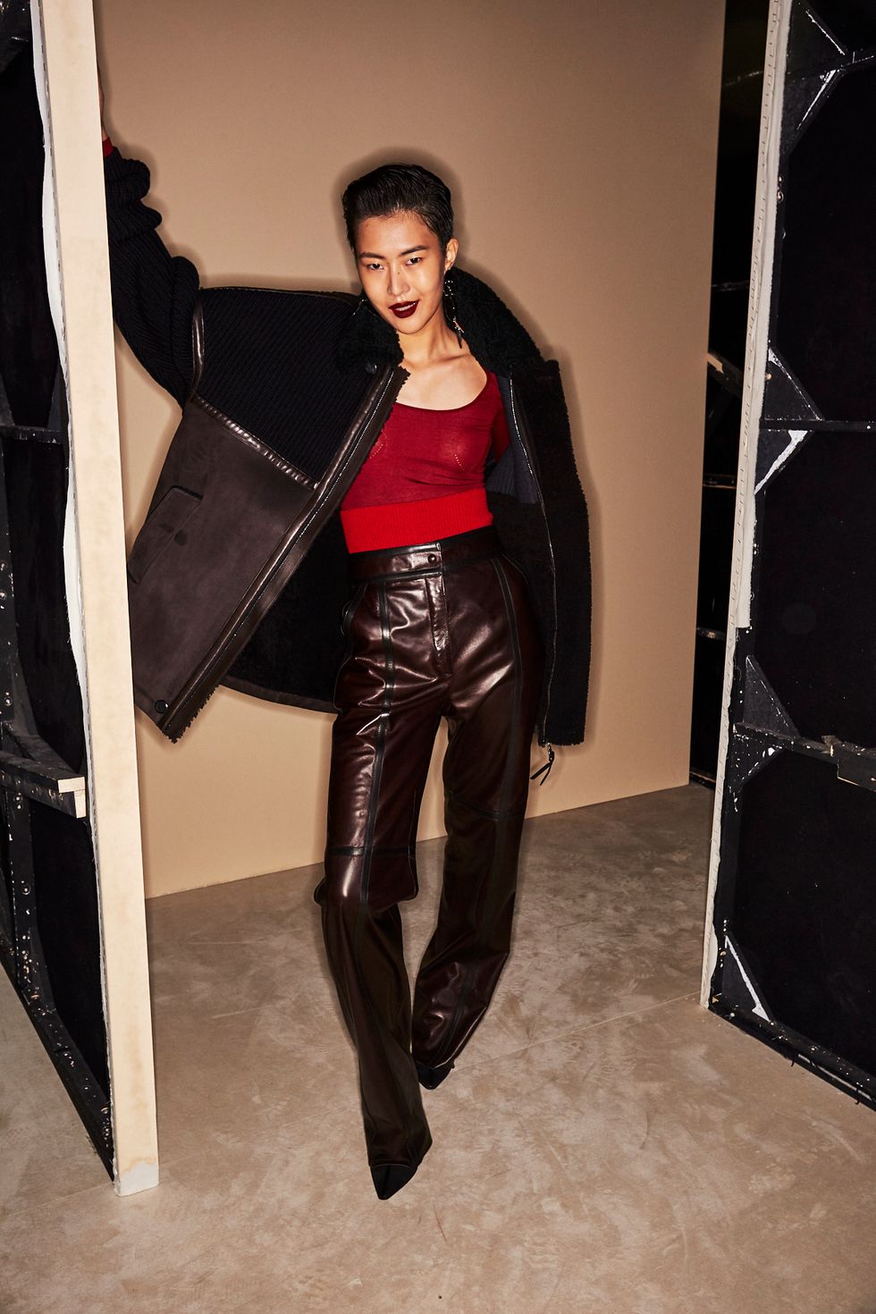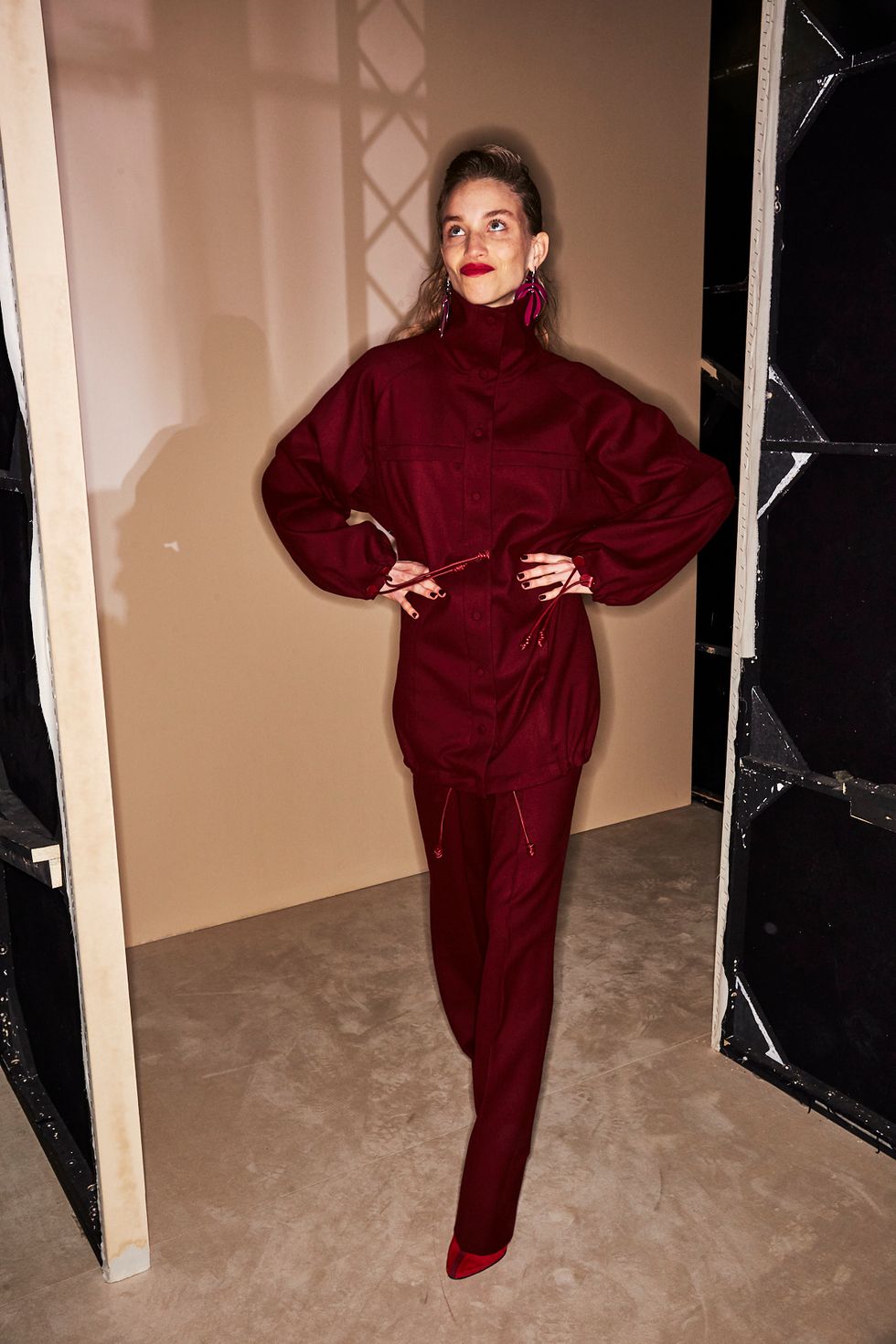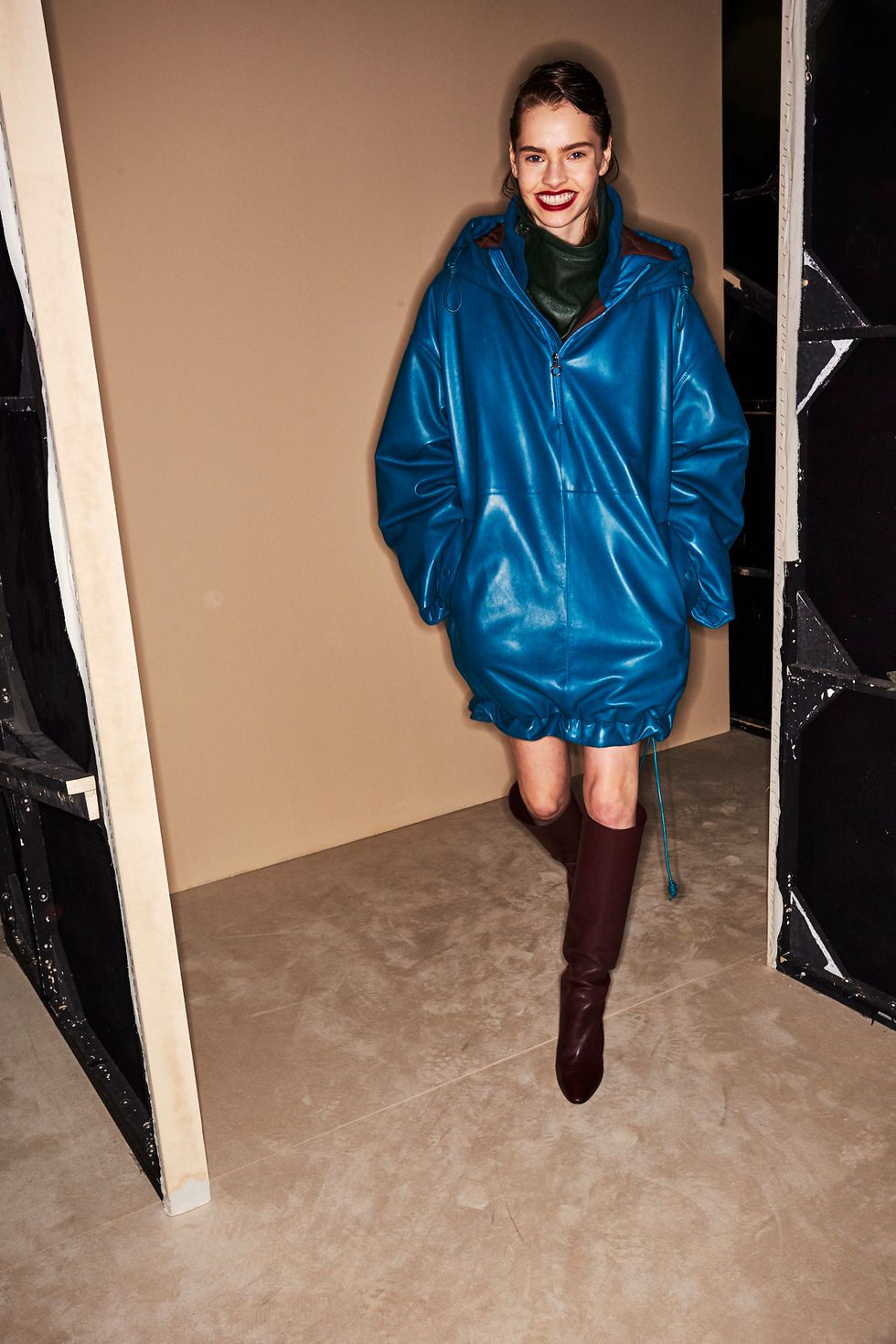 The women's outerwear — mainly the puffed leather robe coat and the colorful parkas — were structured with high volume so that they commanded space within a room.