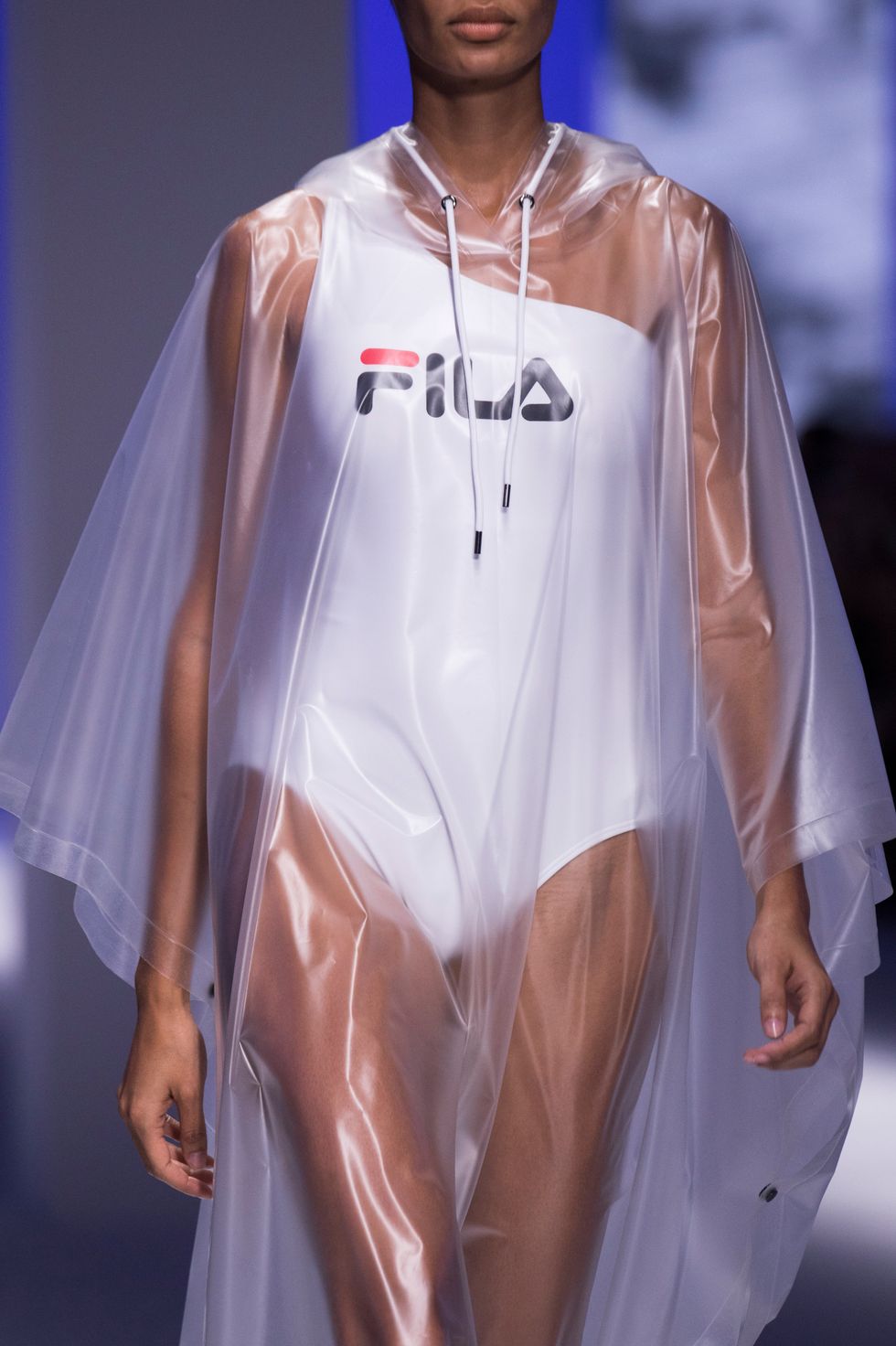 Draped over a one shouldered swimsuit and topped with a vizor, Fila's clear plastic poncho was impossible to disassociate from the blood spattered iteration in American Psycho. Try getting a reservation at Dorsia now.