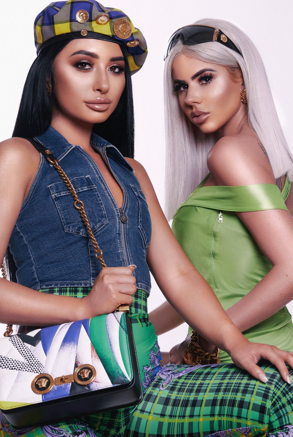 (On Naomi): Top, Pants, Hat & Bracelet by Versace, Bag by Versus, Earrings by Chanel (On Hannah): Dress & Jewelry by Versace