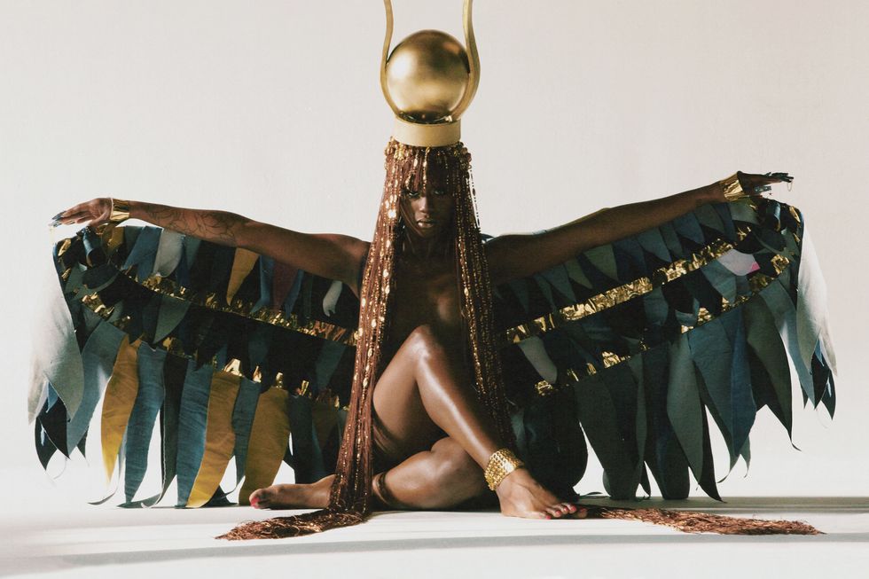Beaded hair: Misa Hylton x Terrence Davidson, Gold crown and denim wings: Misa Hylton x Diesel, Denim nails: Misa Hylton x Eri Ishizu x Diesel, Anklet: Misa Hylton x Martine Ali