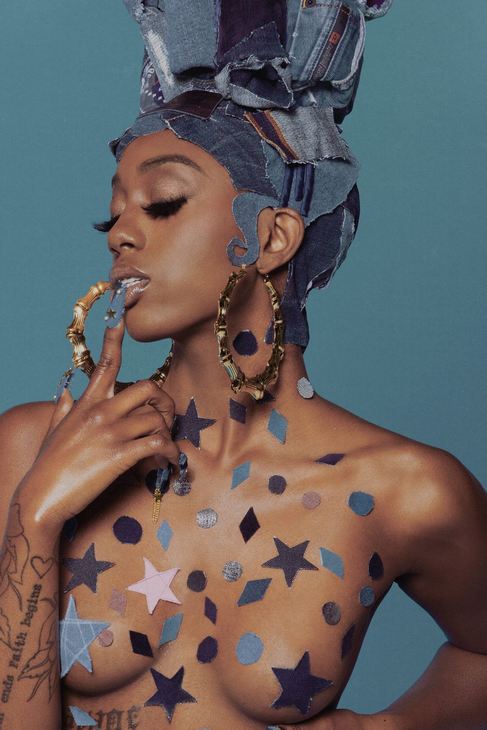 Denim hair: Misa Hylton x Terrence Davidson x Diesel, Denim pasties: Misa Hylton x Diesel, Denim nails: Misa Hylton x Eri Ishuzu x Diesel, Earrings: Simone I. Smith
