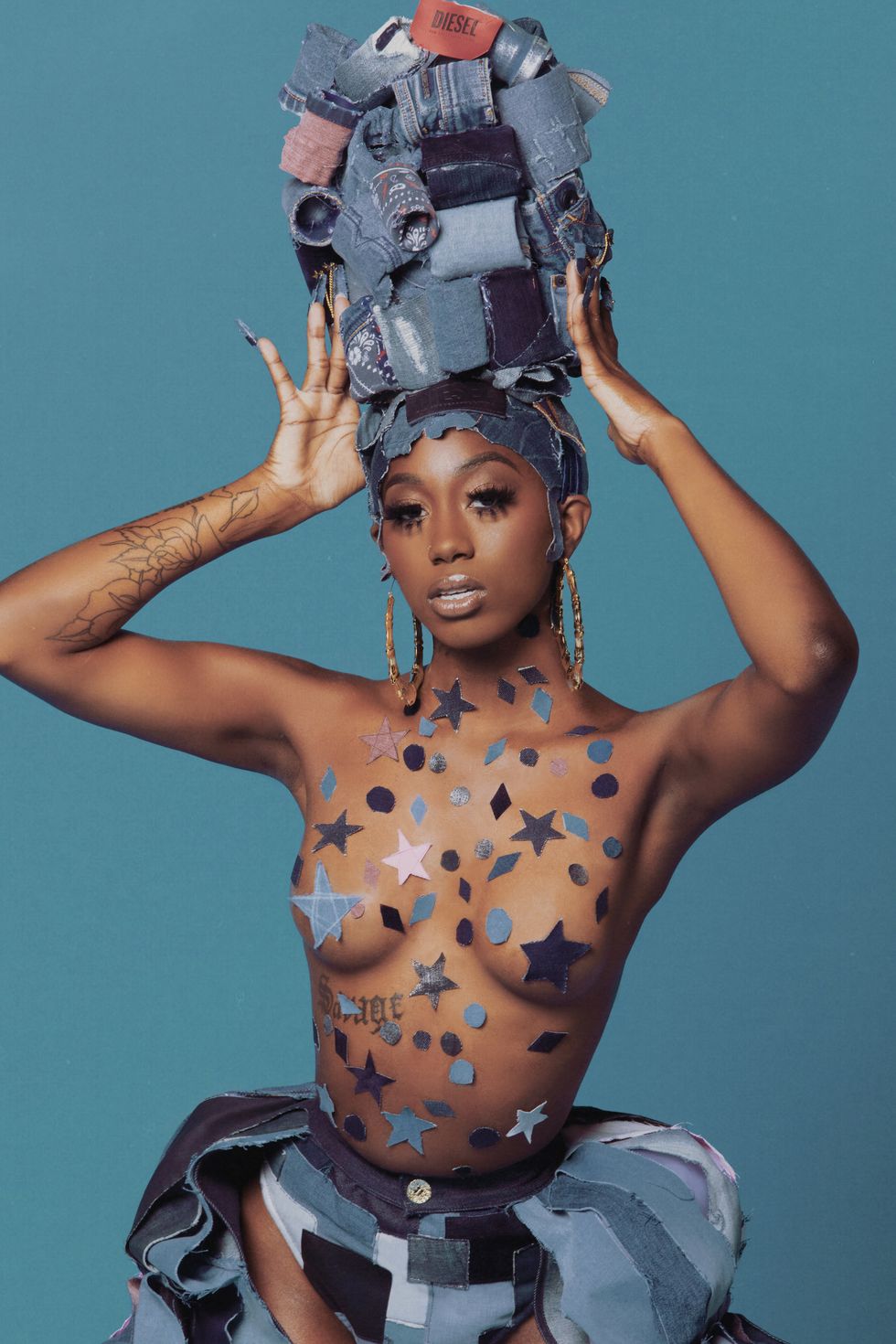 Denim is so distinctly American and the fabric of society and culture. Over 60 pieces of upcycled DIESEL denim were used in the execution of my custom designs for Flo Milli's PAPER "America" cover shoot. We must all do what we can towards sustainability. —Misa Hylton
