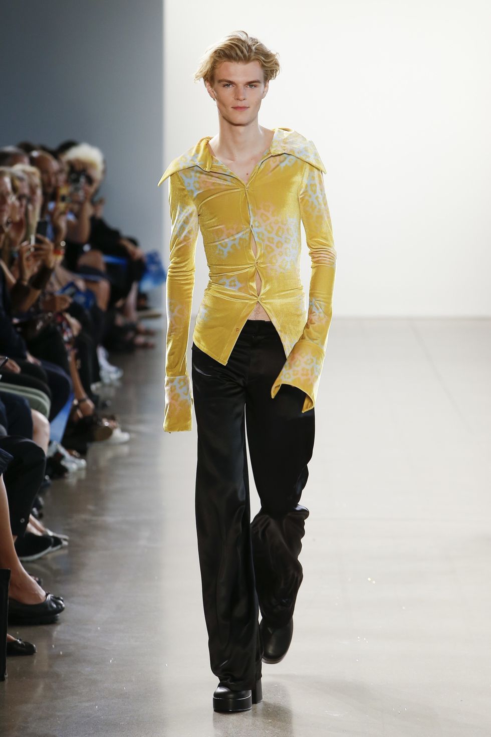 I do love how that mustard look came out, the mustard velvet tight shirt with the silk black pants. And you know, those shirts were purposely meant to be straining at the buttons — again suggesting this strain on silhouette. That was a fun one for me, but the robe closing the collection was a massive surprise. We were like, How are we gonna finish this collection? What is this final moment? Is it another muscle jacket? These WWE guys like Ric Flair, they have these fabulous gowns, big feathers and Swarovski everywhere, so I was like, Why the hell not?
