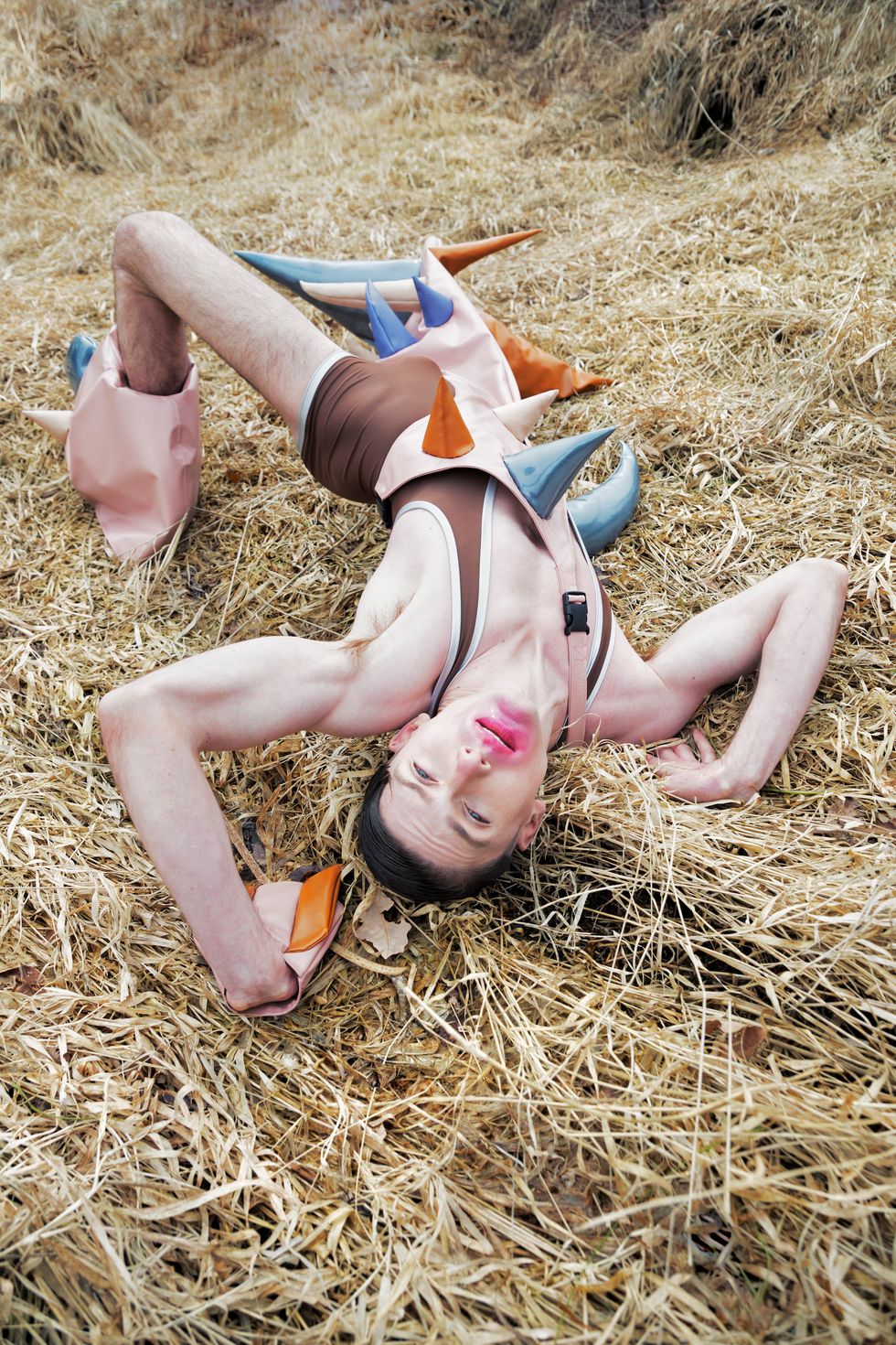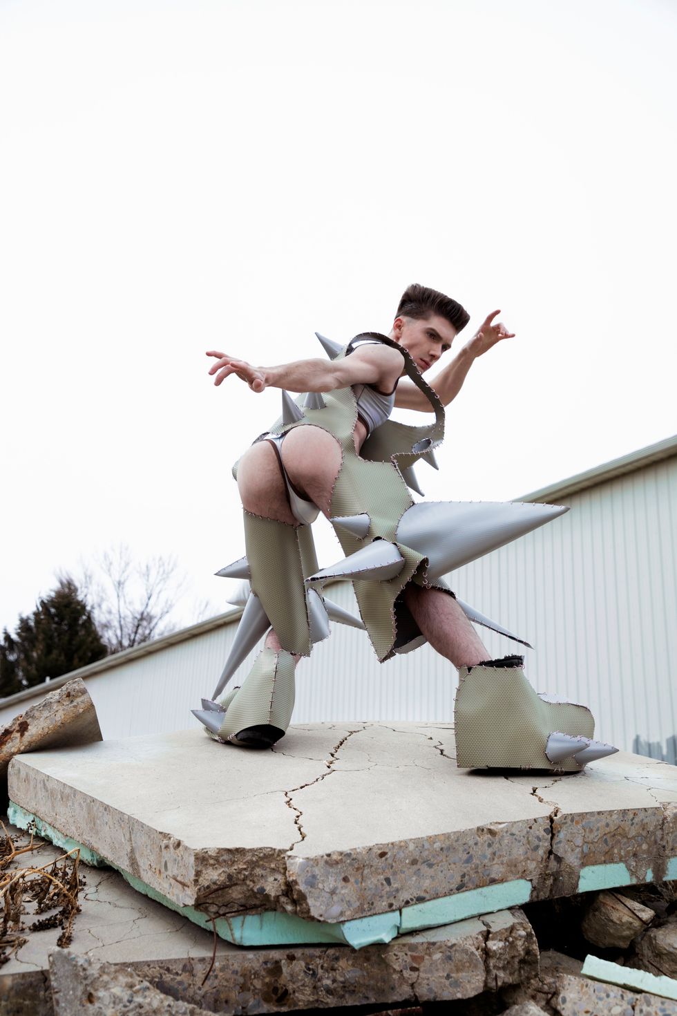 Editorial images of Vogds dressed in exquisitely constructed, self-made bodysuits reflect the dystopian qualities of the track. Gigantic, dinosaur-like boots, are sewn together by massive stitches; rubbery spikes protrude from each and every side of the garments. Vogds has transformed into a monstrous, seemingly prehistoric, mark on a sort of queer futurism.