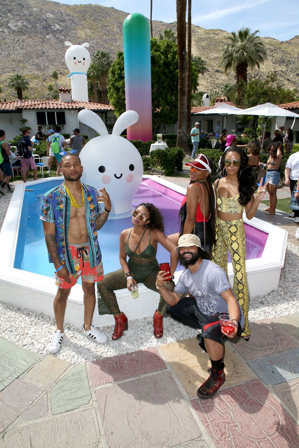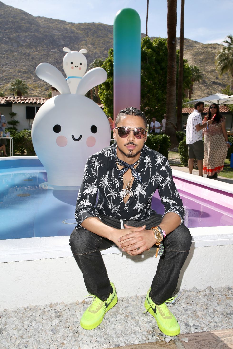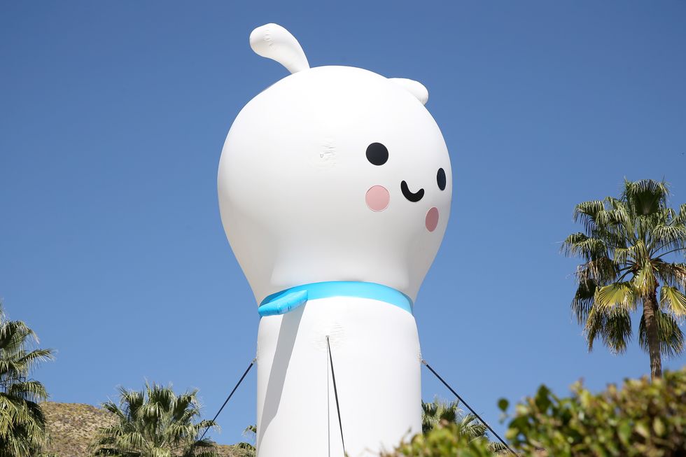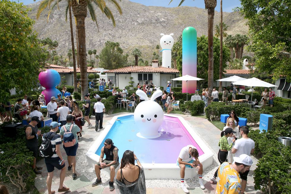 Sprinkled throughout the space at Avalon Palm Springs, artist duo Friends With You (Samuel Albert Borkson and Arturo Sandoval) designed cutesy, childlike characters in pastel gradients to create an immersive escape from reality — their signature. Platinum House featured simple, smiling creatures dropped in pools, towering blow-up versions with rouged cheeks, and fuzzy ones with big, floppy ears.