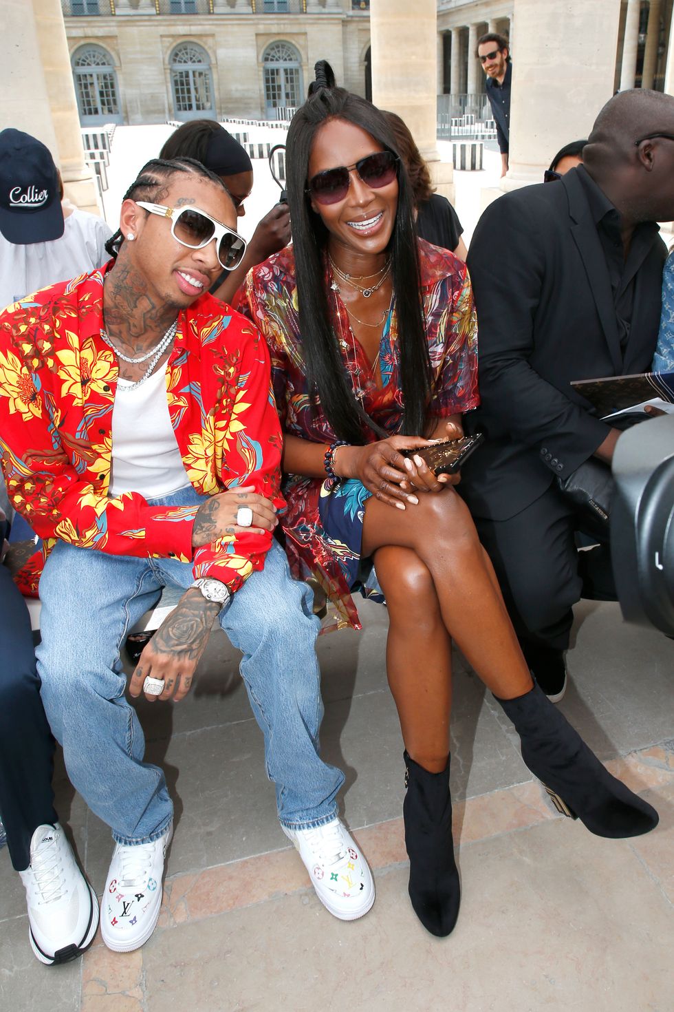 If you can get Naomi in your front row, you know you're doing something right. Such was the case at Louis Vuitton men's where La Campbell was spotted in a pyschadelic floral print shirt dress from the collection (seated next to Tyga).
