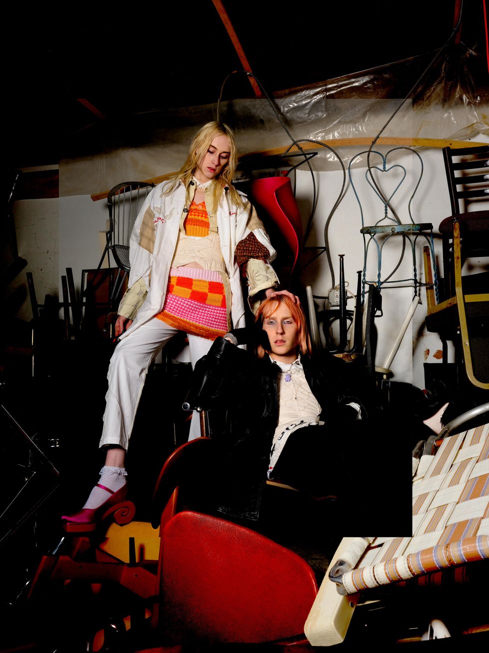 (On Angel) Jacket, shirt and corset: Helena Eisenhart, Knit set, trousers and shoes: Tyler McGillivary (On Lulu) Clothing and accessories: Helena Eisenhart