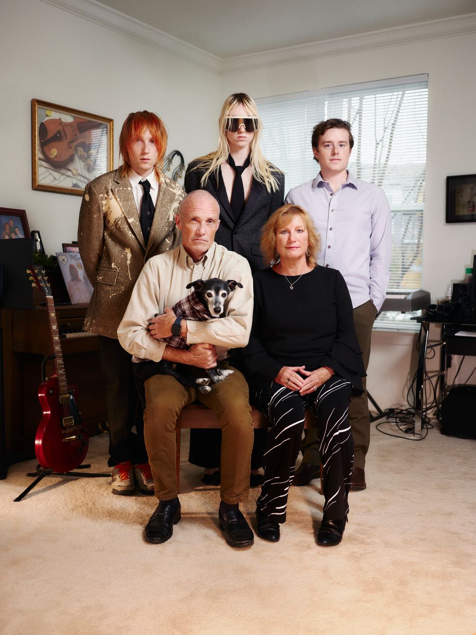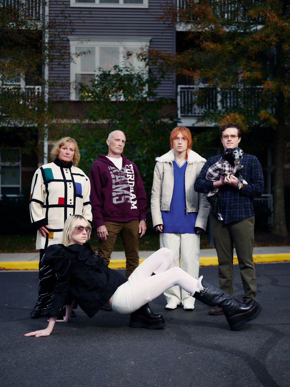 Gathered in their family’s own Hearth Room, they posed for PAPER, Lulu and Angel layered in their signature out-of-the-box garments, shining like the supernovas that they are. Yes, they are The Frost Children. They are also Lulu and Angel Prost, back just in time for this year’s Christmas cards. They pose, with a glamorous stare. Brian, Diane and Bob cozied up next to them. It’s a family affair.