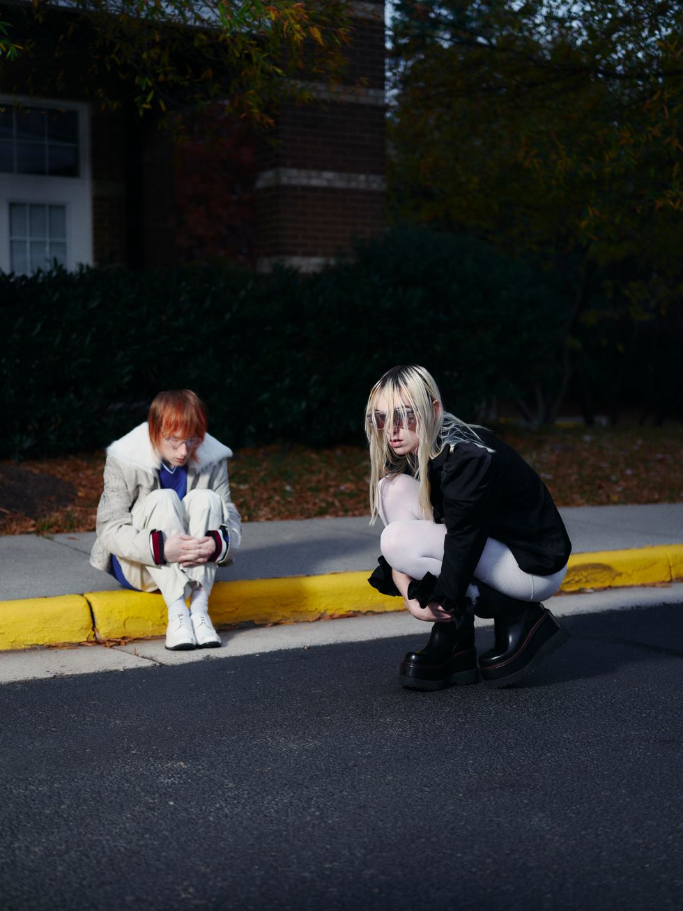 (On Angel) Shirt: Willy Chavarria, Skirt: Ekhaus Latta, Tights: Calzedonia, Shoes: R13, Sunglasses: Max Mara (On Lulu) Jacket: Eckhaus Latta, Sweater: Tommy Hilfiger, Pants: Carhartt, Glasses: Mykita