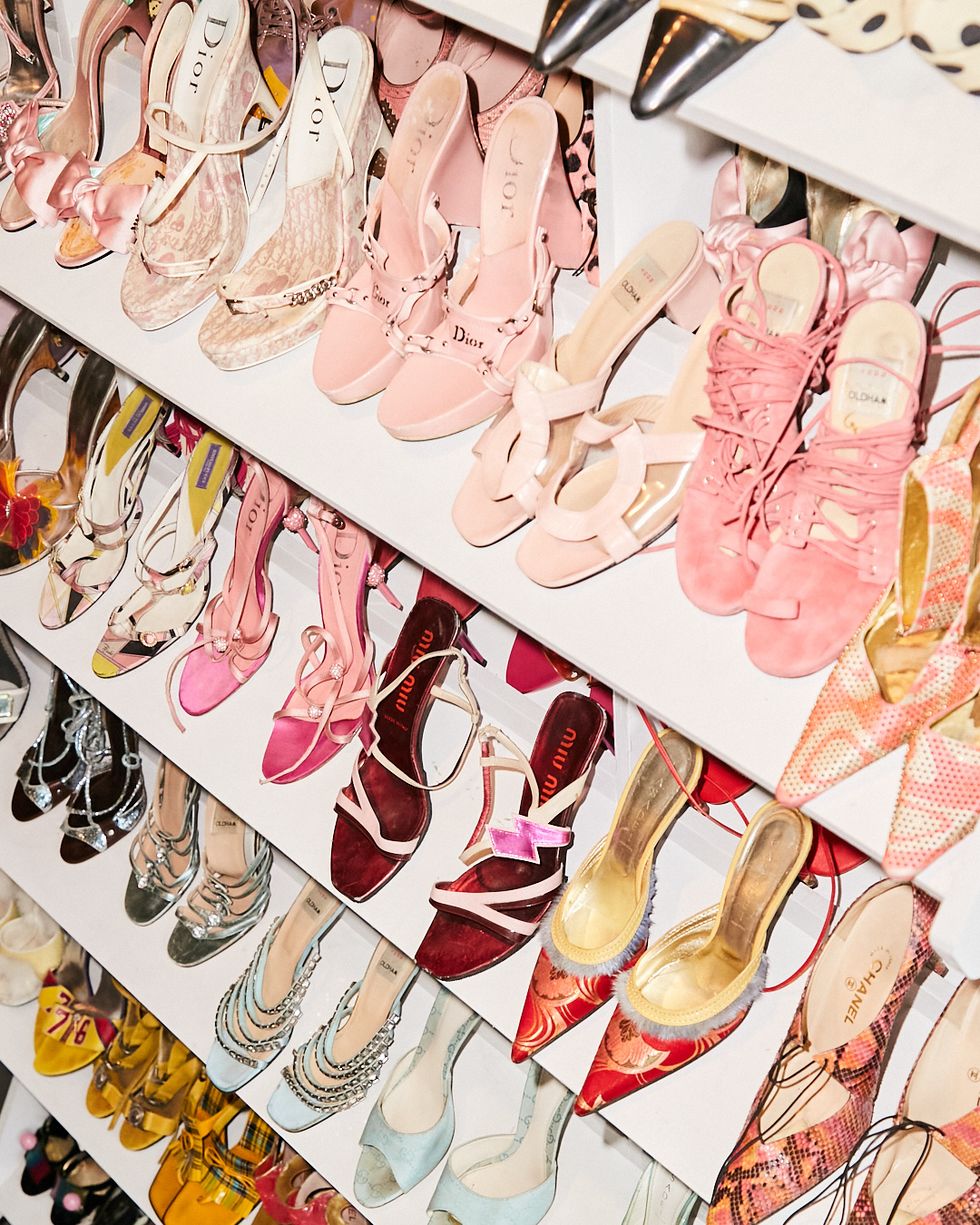 Held gestures toward garment racks lined up throughout the open loft space. There are 20 of them organized by color and they contain an estimated 2,000 pieces sourced from well over a decade of thrifting. The assortment is a visual feast: there's an accessory table and a mountainous shoe wall consisting of approximately 1,000 more pieces combined. Having started as a personal collection, Held's archive has come a long way from when it was "just two garment racks and a rusty coffee can full of loosey rings."