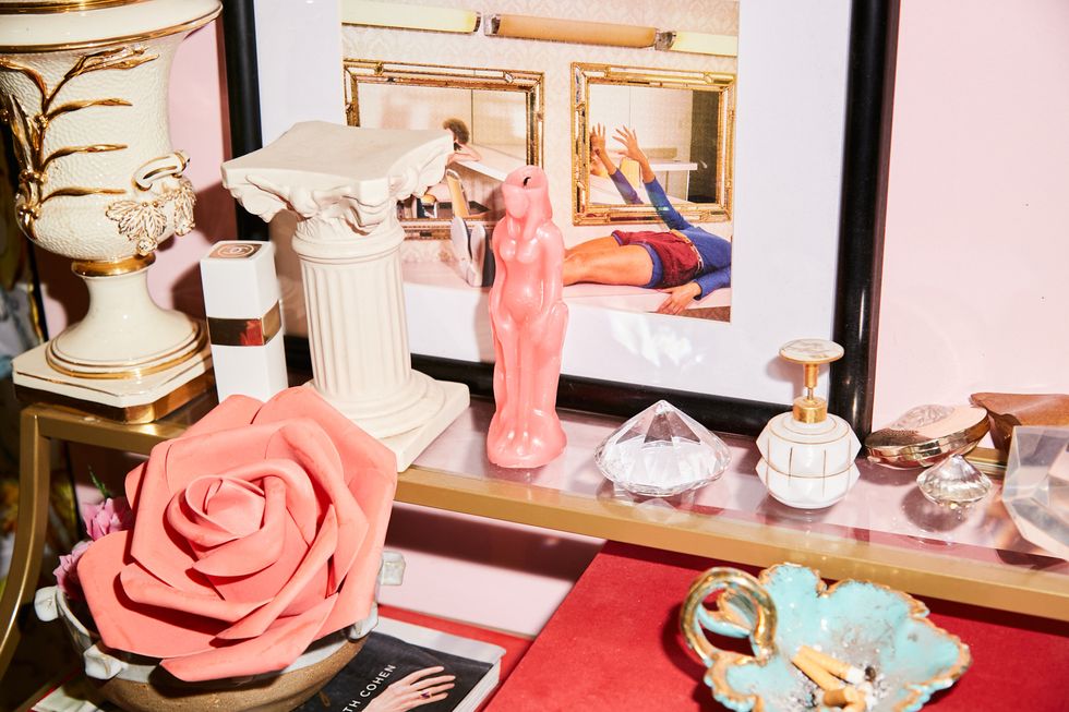 Now, Gabriel Held Vintage draws the attention of major pop acts and supermodels who want to come by the studio and play around. The space opens up into a sitting area framed by a blush couch and several leopard print Versace chairs. A printed Gucci shower curtain separates a changing area for privacy. On Held's coffee table, there are scraps of chainmail, press-on nails, a miniature white patent Fendi bag and an iced coffee that he sips in-between drags of his cigarette. Polaroids of recent collaborators, including everyone from Lourdes Leon to Keke Palmer and Brooke Candy, plaster the walls.