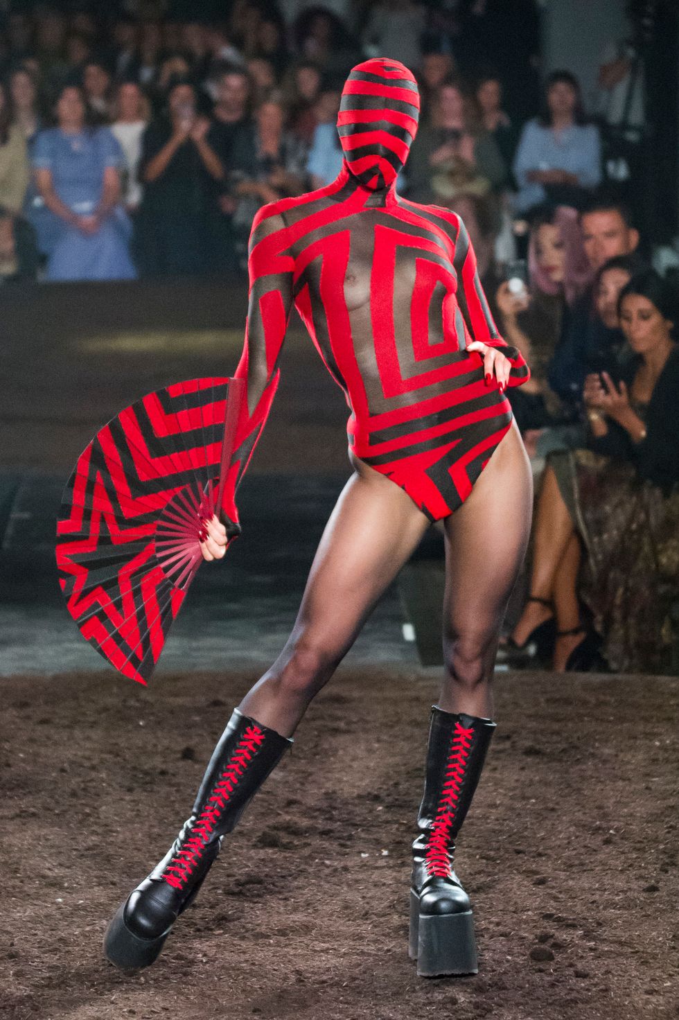 The first model out of the shadows and onto the dirt was a fitting introduction to Pugh's narrative. A faceless figure in zig-zagging stripes with a vogue-worthy fan in hand, they were an electrifying disruption of what we've come to expect from the catwalk. What followed was a motley crew in acid-latticed and flame-printed trenches, leathery latex turtlenecks, and ball-gagged face masks. Electric shocks of hair flying haphazardly out from heads on some models while, on others, vintage marcel waves lent an old school touch to the show's anarchic punk overtones.
