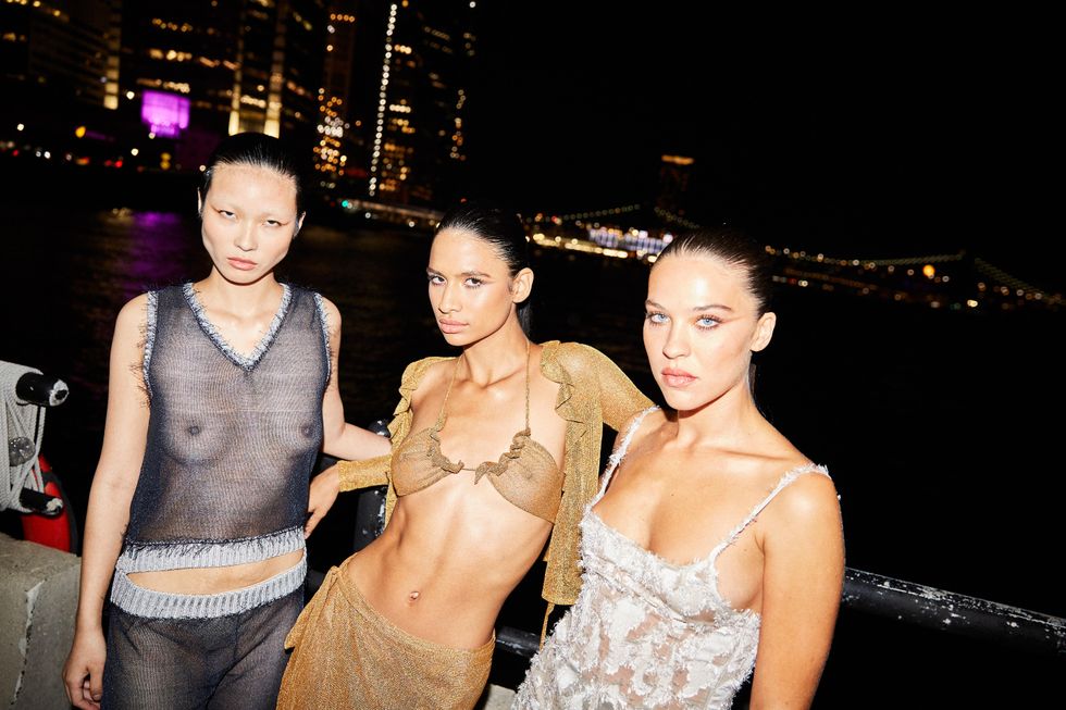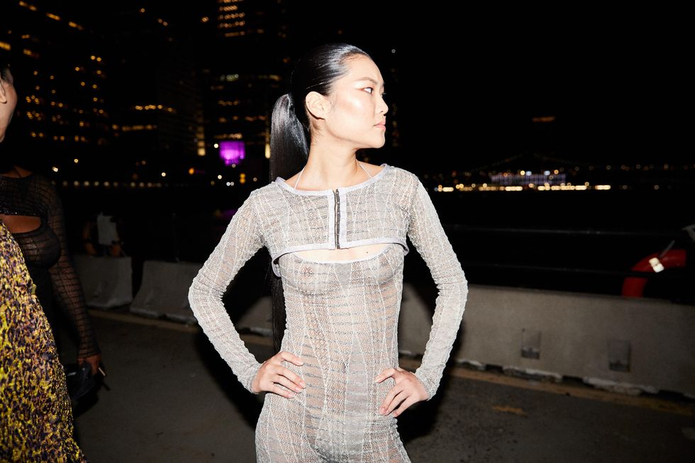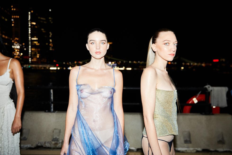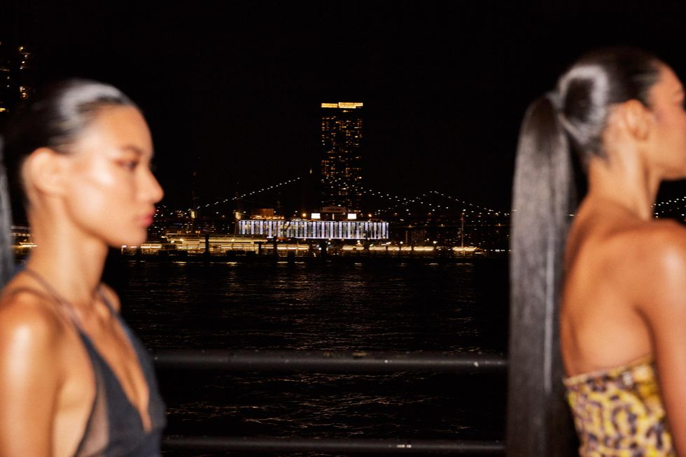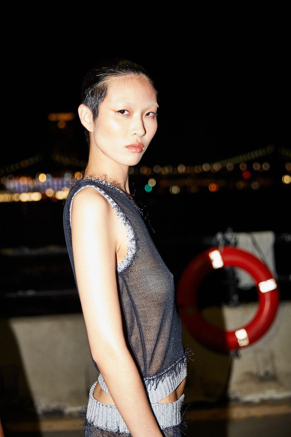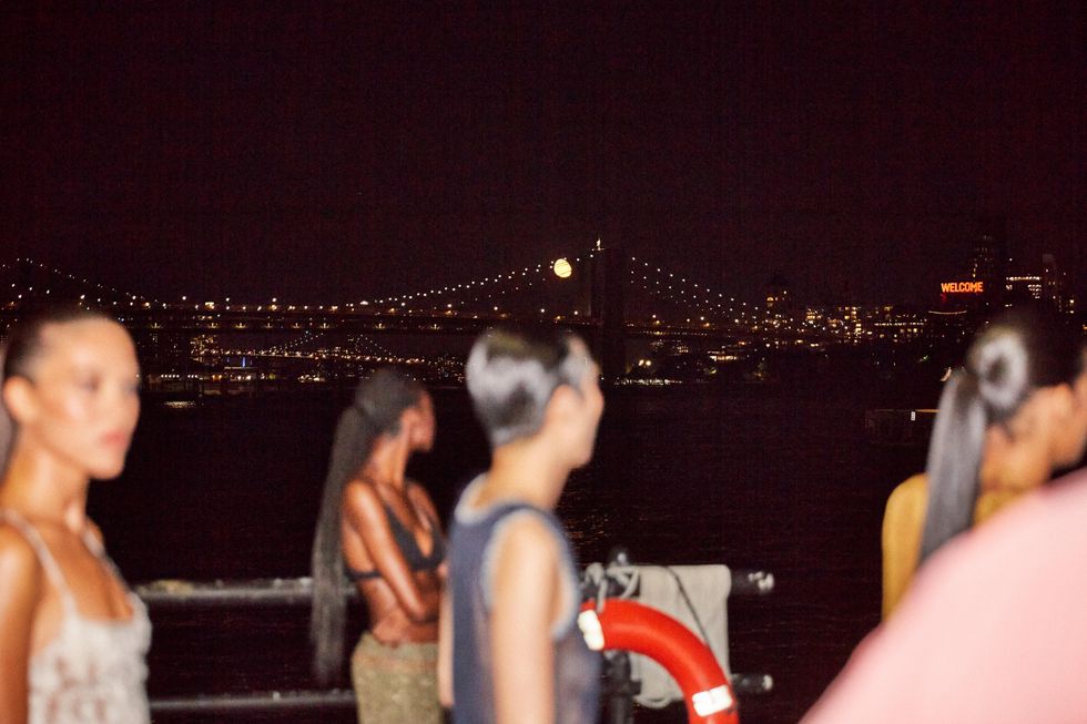 The moon was full and bright, beaming through the Brooklyn Bridge as seated guests on the East River Helipad snapped iPhone pics — a little pre-show content before Gauntlett Cheng’s return to New York Fashion Week after several years away. Two long rows of chairs lined the downtown Manhattan platform, where helicopters typically land and take off, with low LED lights creating a cinematic, seductive runway setting. “Almost Dead” by Jonah Almost and D3AD6OY blasted from the speakers, answering to the ravers in attendance, vaping away.