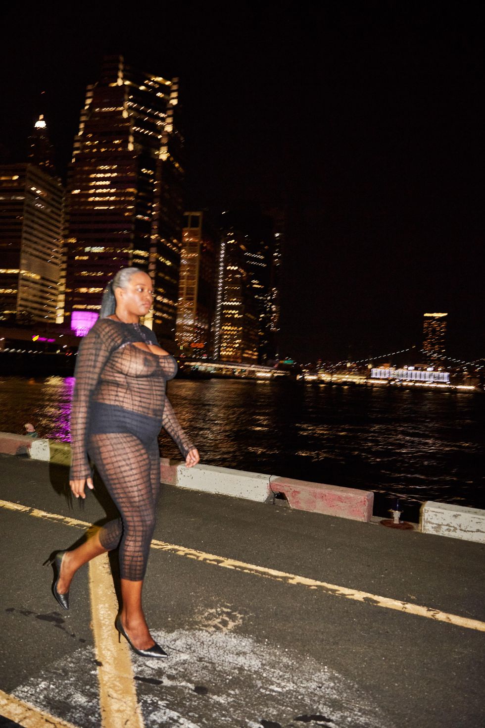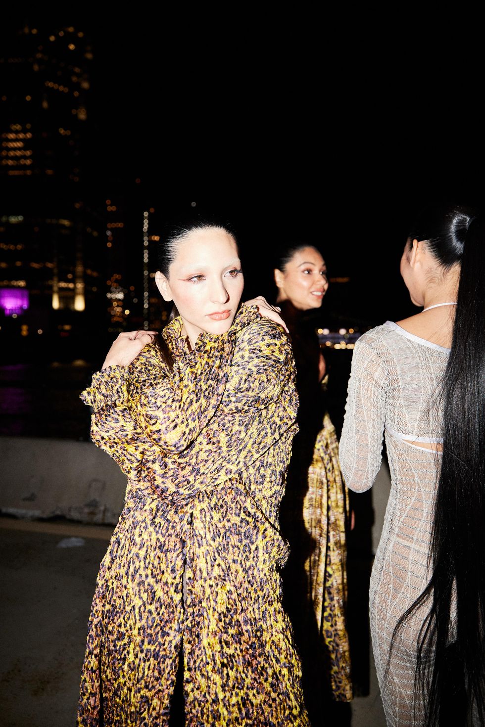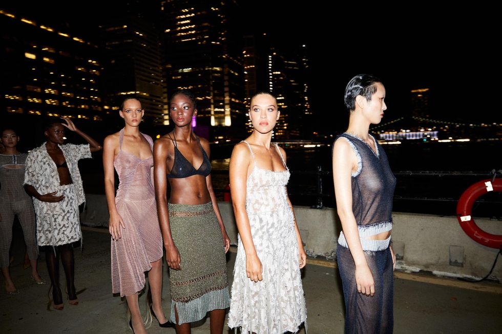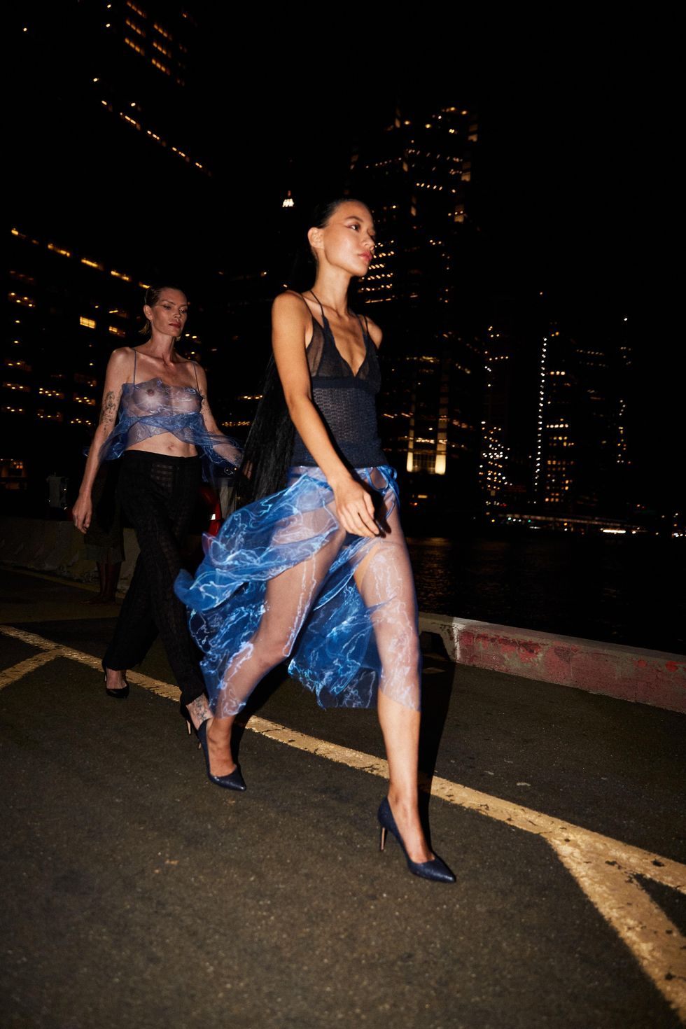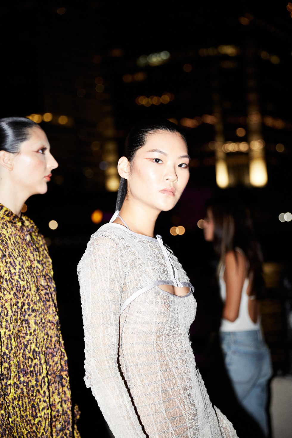 The moon was full and bright, beaming through the Brooklyn Bridge as seated guests on the East River Helipad snapped iPhone pics — a little pre-show content before Gauntlett Cheng’s return to New York Fashion Week after several years away. Two long rows of chairs lined the downtown Manhattan platform, where helicopters typically land and take off, with low LED lights creating a cinematic, seductive runway setting. “Almost Dead” by Jonah Almost and D3AD6OY blasted from the speakers, answering to the ravers in attendance, vaping away.