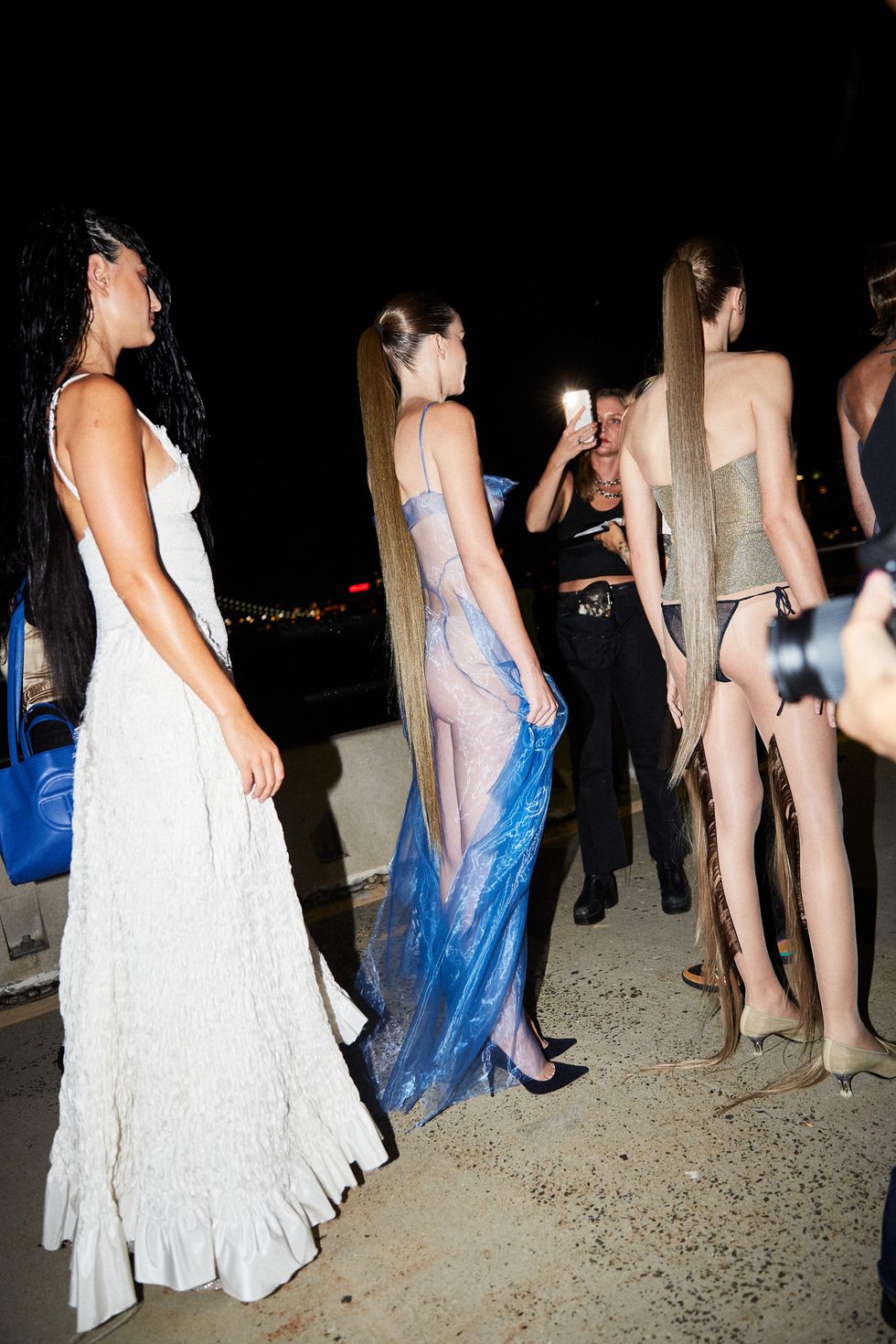 True to Gauntlett Cheng, this season continued with a heavy emphasis on knitwear, as well as the naked body. Sheer, shimmering skirts revealed underwear, with some dresses designed to resemble fabric cascading around models’ bare figures like wind or water skating across the skin. Behind them, the moon reflected on the river to similar effect. Ponytails were long and overly exaggerated, matching hair extensions that dangled from stockings and blew in the wind.