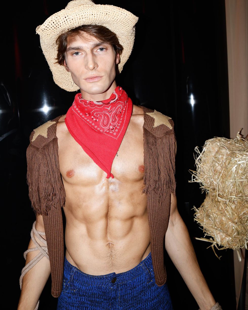 Styled by Alec Malin, with hair by Charlie Le Mindu and glam by Frankie Boyd, the show presented a parade of characters pulled from deep within the gay psyche -- leathermen, sailors, firefighters, jocks -- all rendered through Schmidt’s playful lens. There was nothing sheepish about the silhouettes, sorry I couldn’t let that one go by.From a knit hospital gown, a must for any playing-doctor fantasy, to a set of farmer’s overalls, no archetype was left unaccounted for.