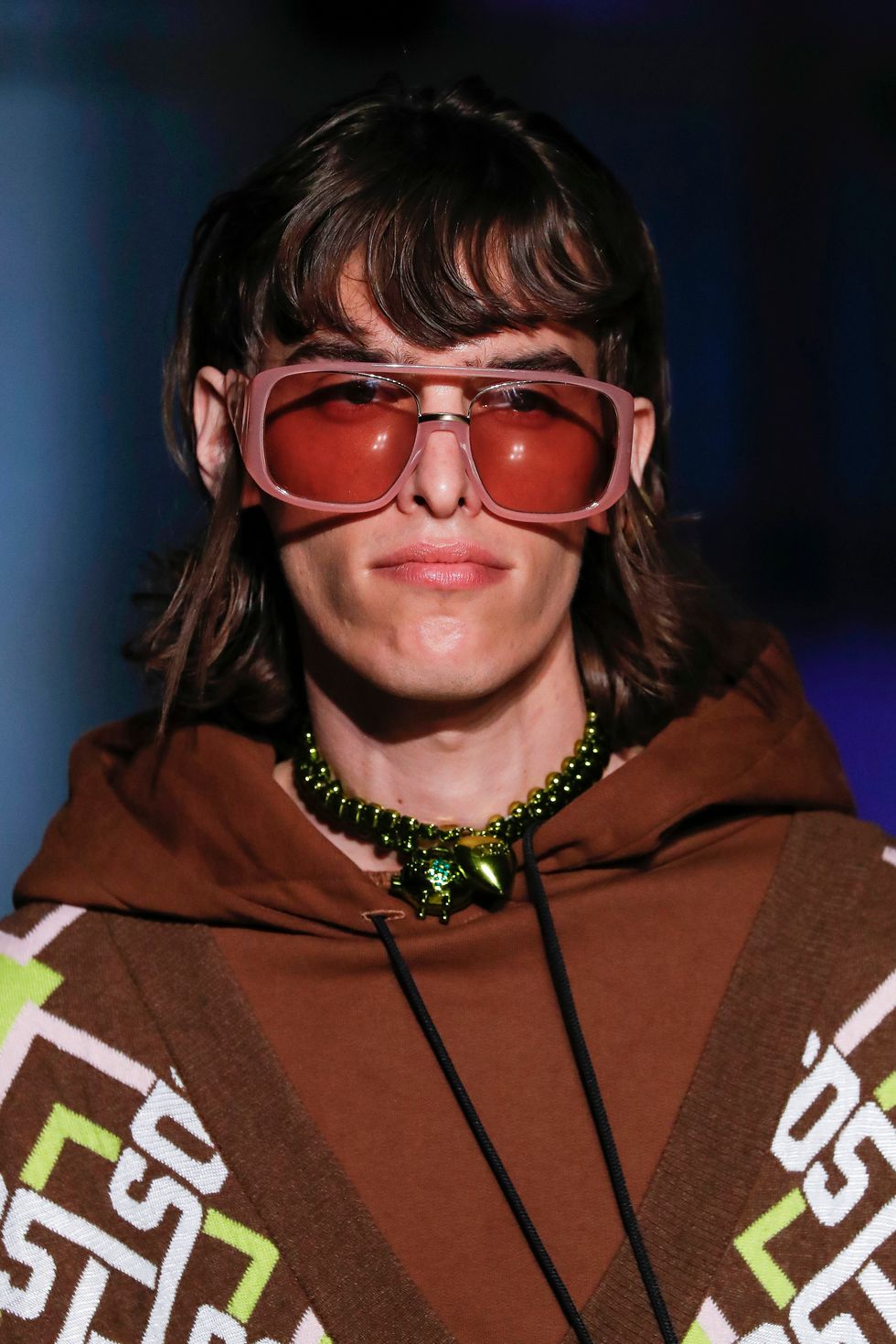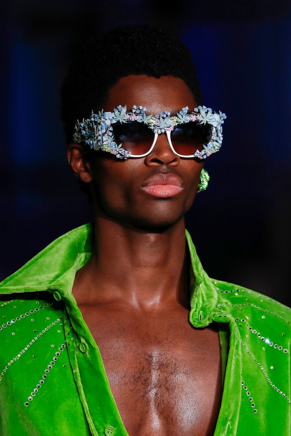 This season marks GCDS' first full sunglasses collection in partnership with eyewear manufacturer Marcolin (which works with brands like Tom Ford, Bally and Diesel). The range includes a variety of styles from oversized rose-tinted aviators to elaborate sunglasses decorated with floral appliqués as seen on model Alton Mason.