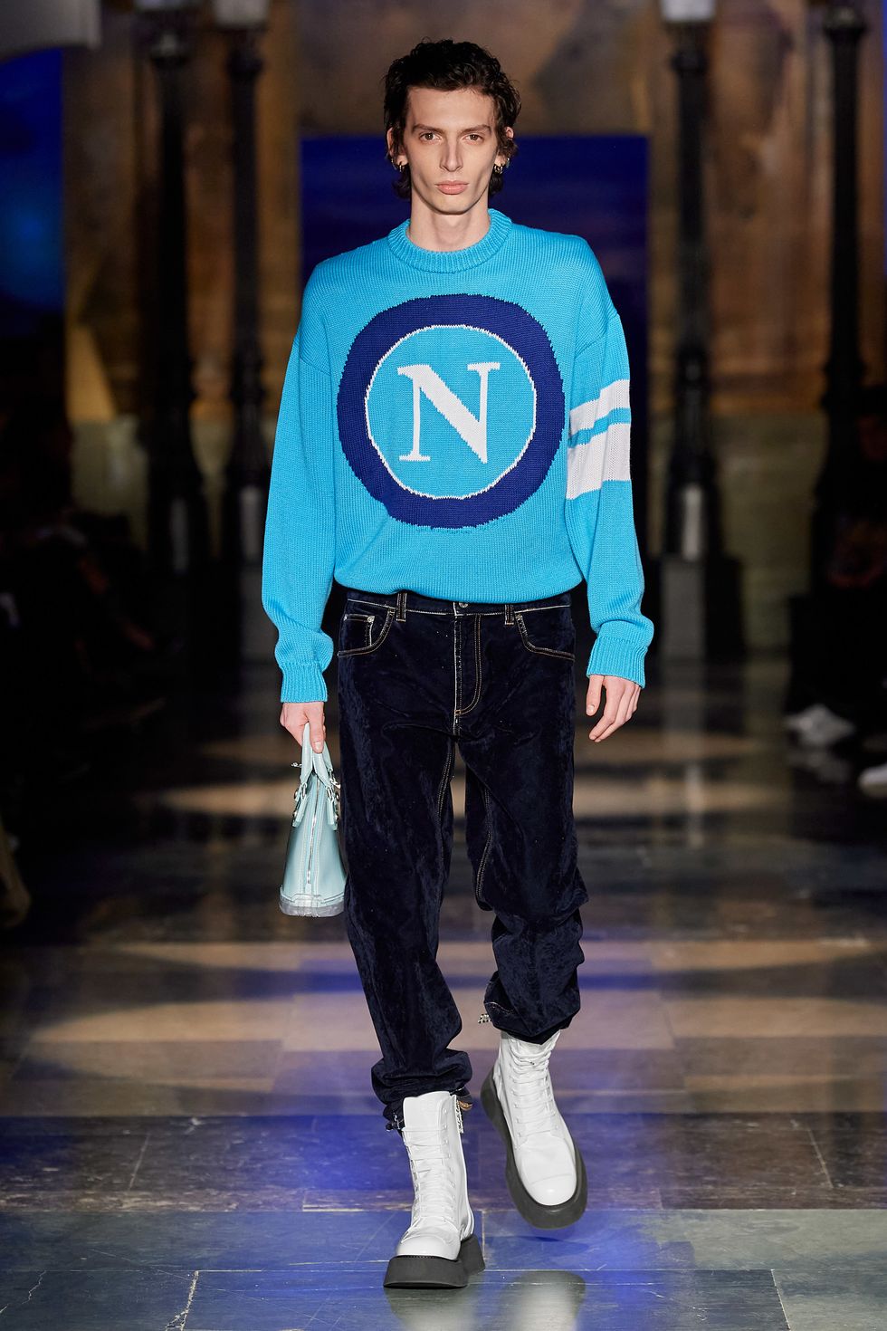 Calza's love letter to the southern Italian city manifested itself in an abundance of cheeky references and playful details, all of which draw from Naples' distinct sense of "extra," according to the show notes. While last season's collection was inspired by all things manga, this lineup incorporated more subdued colors than last time and featured distinct silhouettes from '80s and '90s pop.