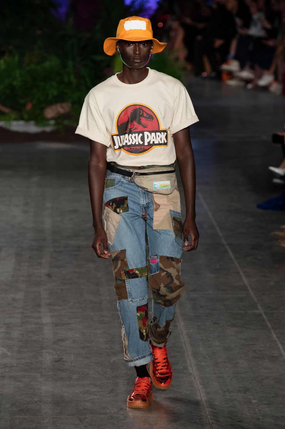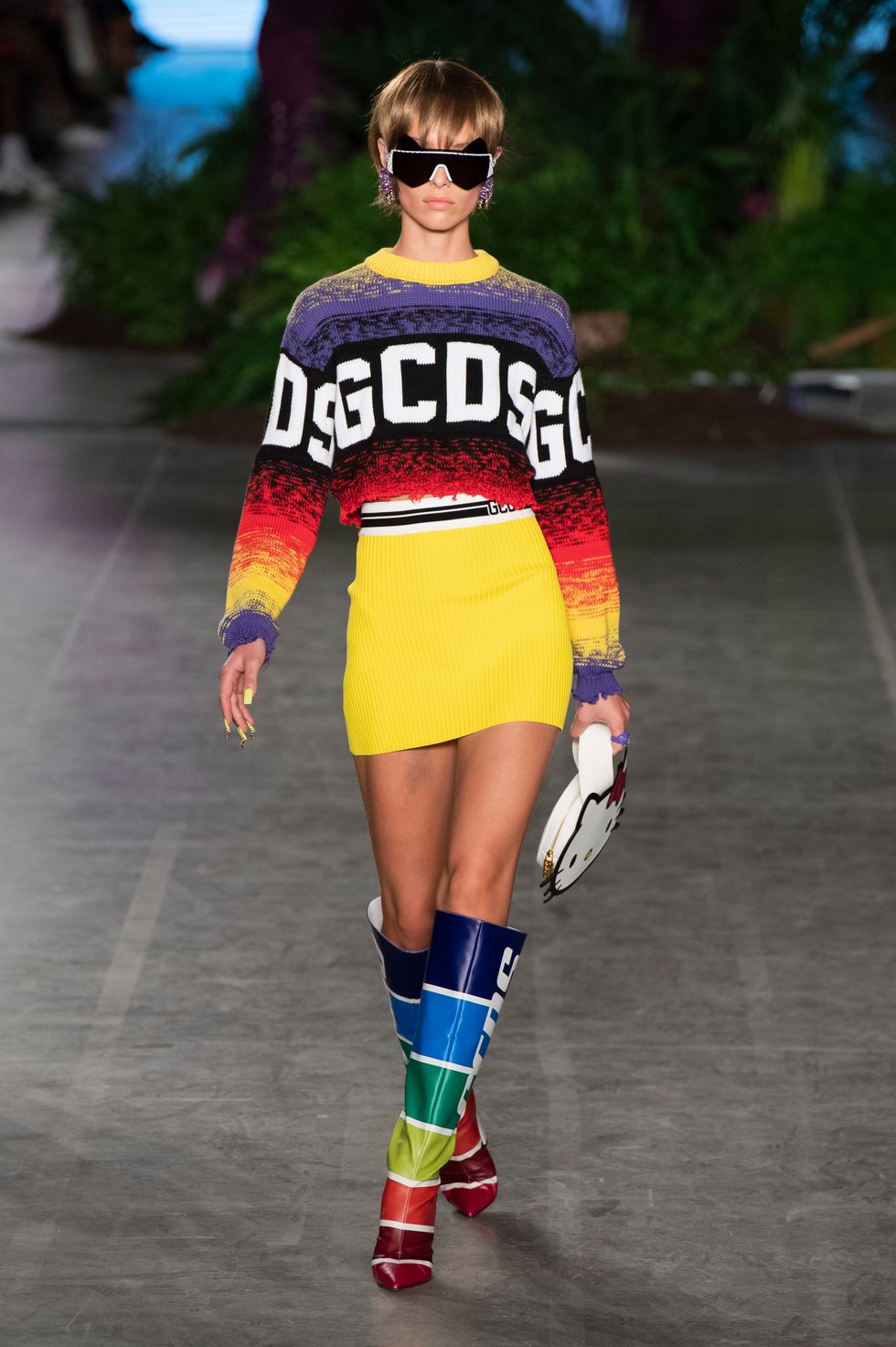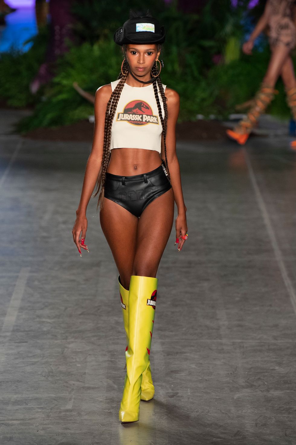 Before the first model emerged on the runway, a curtain that was hung in the middle of the set dropped to reveal a 45-foot animatronic T-Rex, setting the stage for what was to come. T-shirts, crop tops, and slick knee-high boots were all printed with Jurassic Park symbols and logos. Even the print from the Jeep in the movie was used on a pair of glossy boots. Other pop cultural references included Hello Kitty, Manga comic book prints, and Hawaii/Kawaii themes in the sunny, tropical collection. Here's everything else you need to know about the Spring 2020 GCDS collection, styled by Anna Trevelyan.