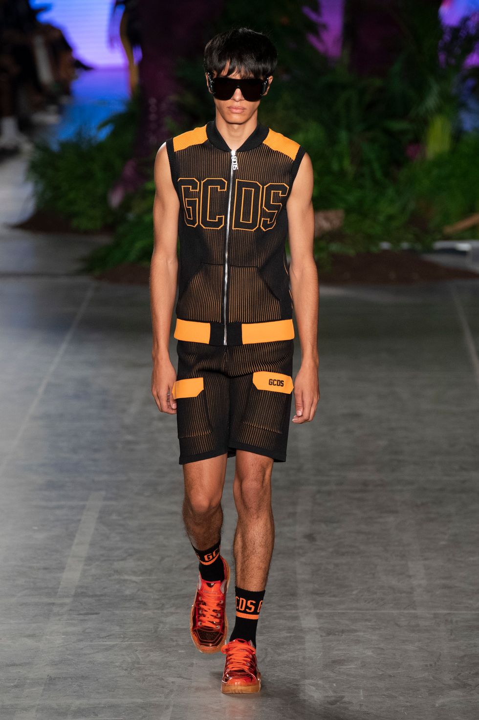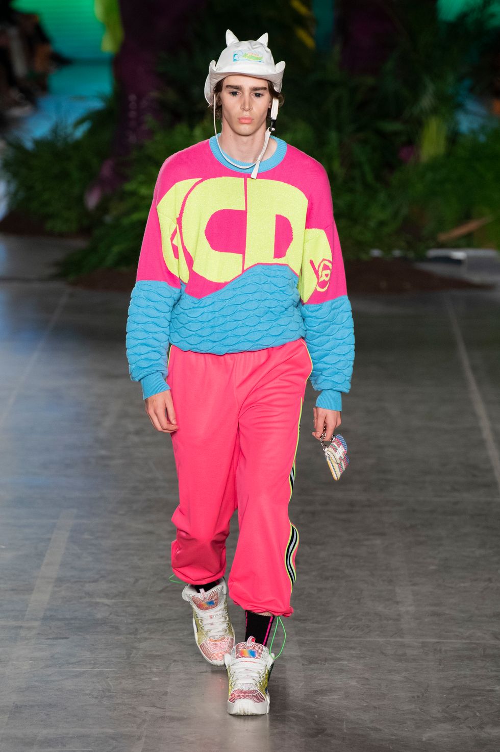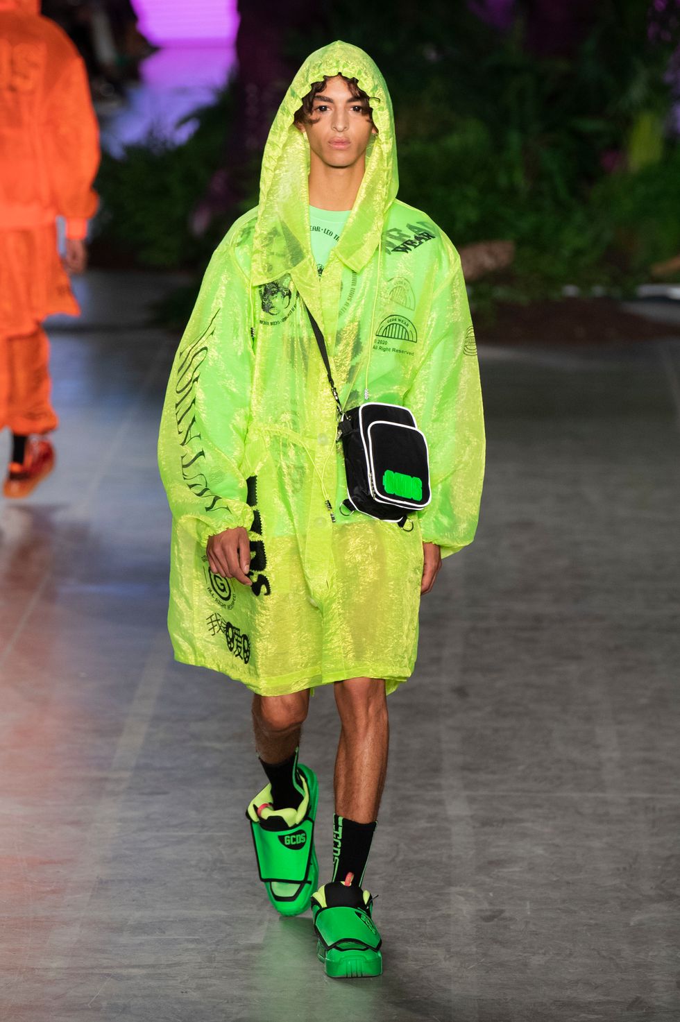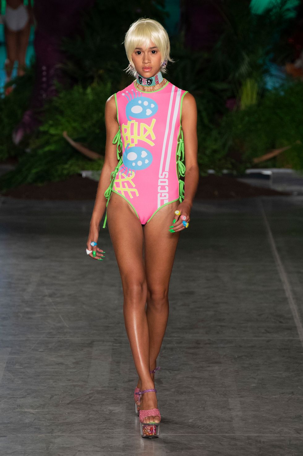 Before the first model emerged on the runway, a curtain that was hung in the middle of the set dropped to reveal a 45-foot animatronic T-Rex, setting the stage for what was to come. T-shirts, crop tops, and slick knee-high boots were all printed with Jurassic Park symbols and logos. Even the print from the Jeep in the movie was used on a pair of glossy boots. Other pop cultural references included Hello Kitty, Manga comic book prints, and Hawaii/Kawaii themes in the sunny, tropical collection. Here's everything else you need to know about the Spring 2020 GCDS collection, styled by Anna Trevelyan.