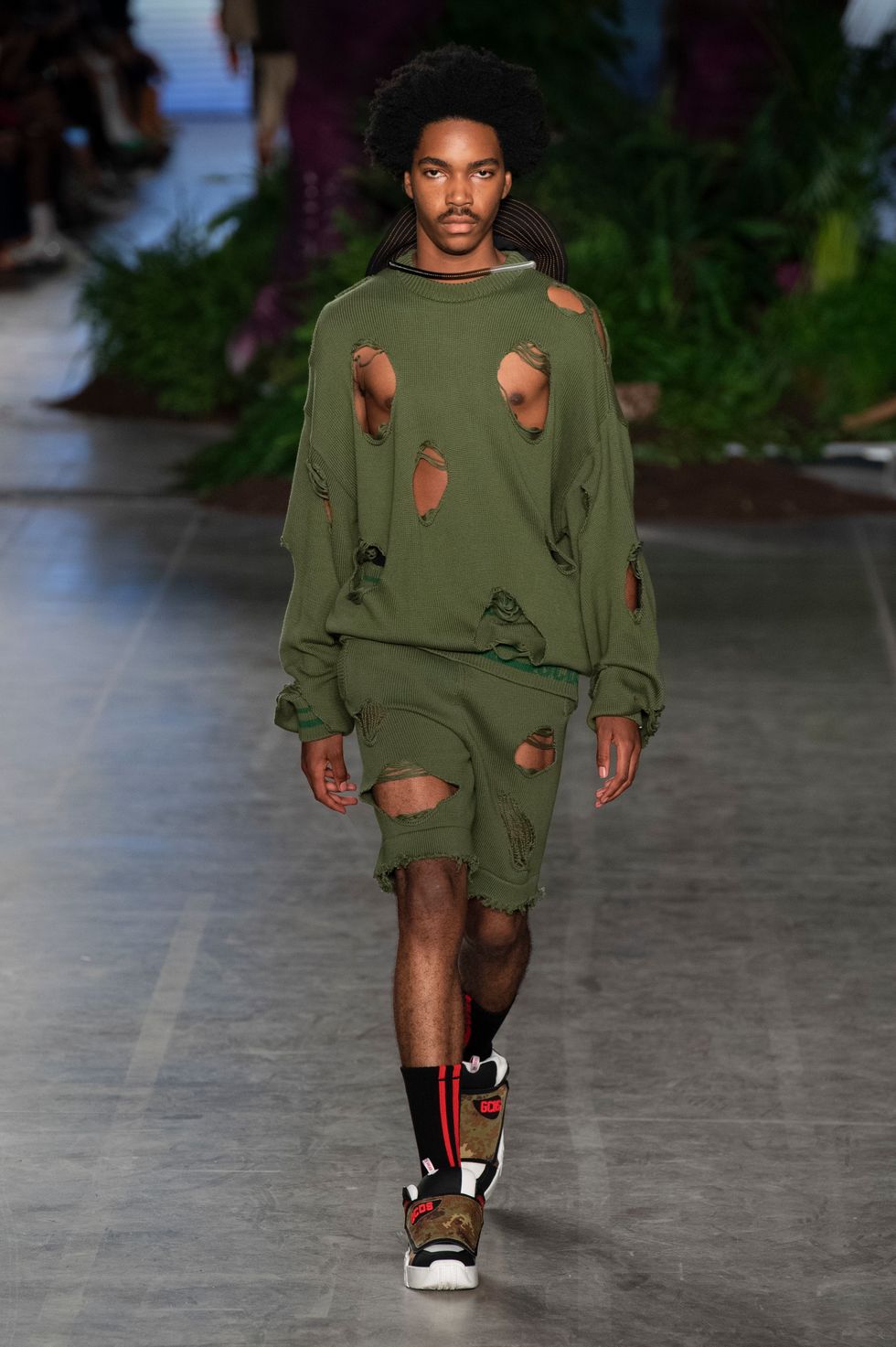 Not only did clothes have prominent Jurassic Park logos on display, but the brand took it even further with an army green sweatshirt/shorts with ripped holes in them, conjuring images of an escape from the jaws of T-Rex.
