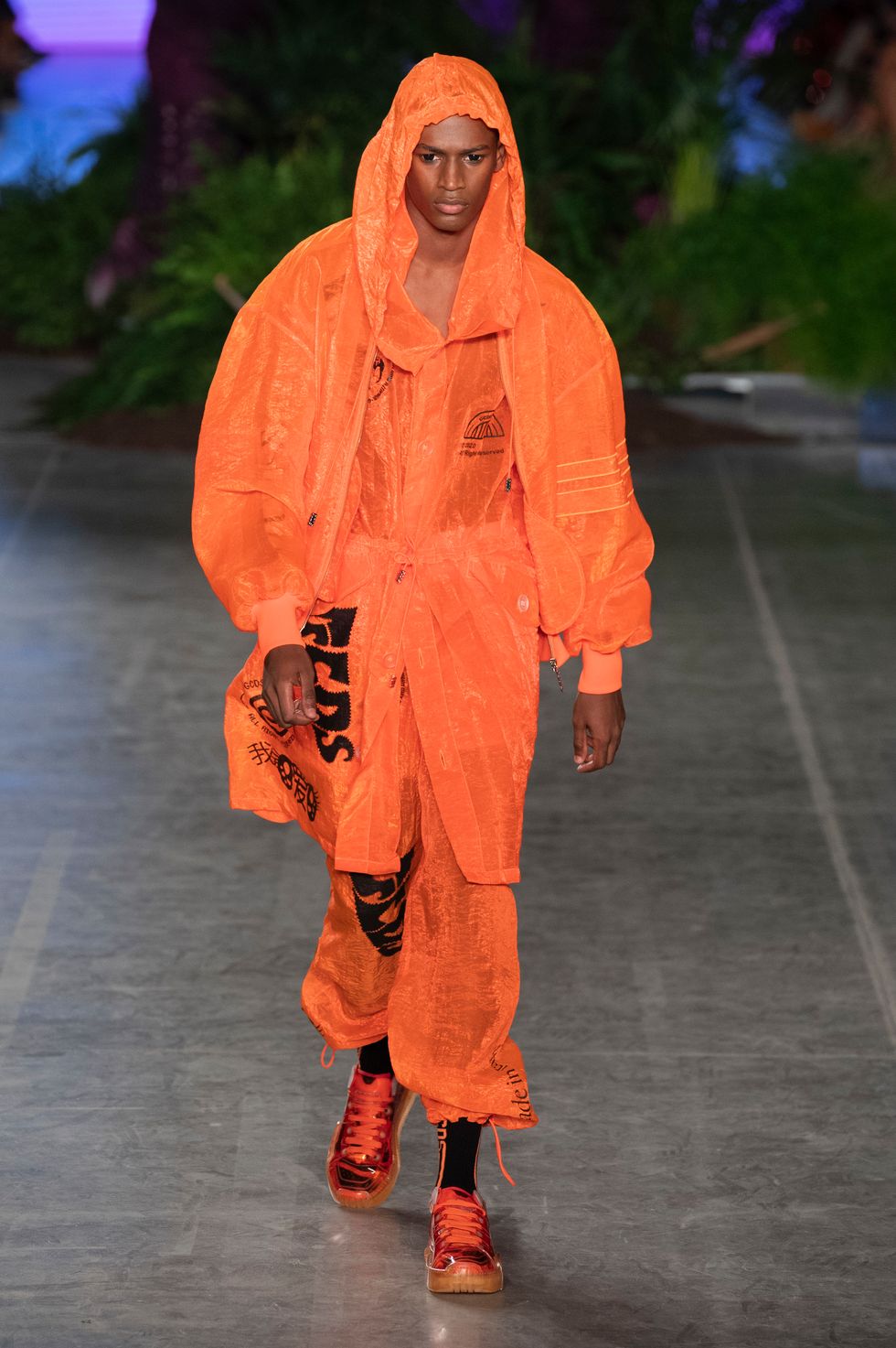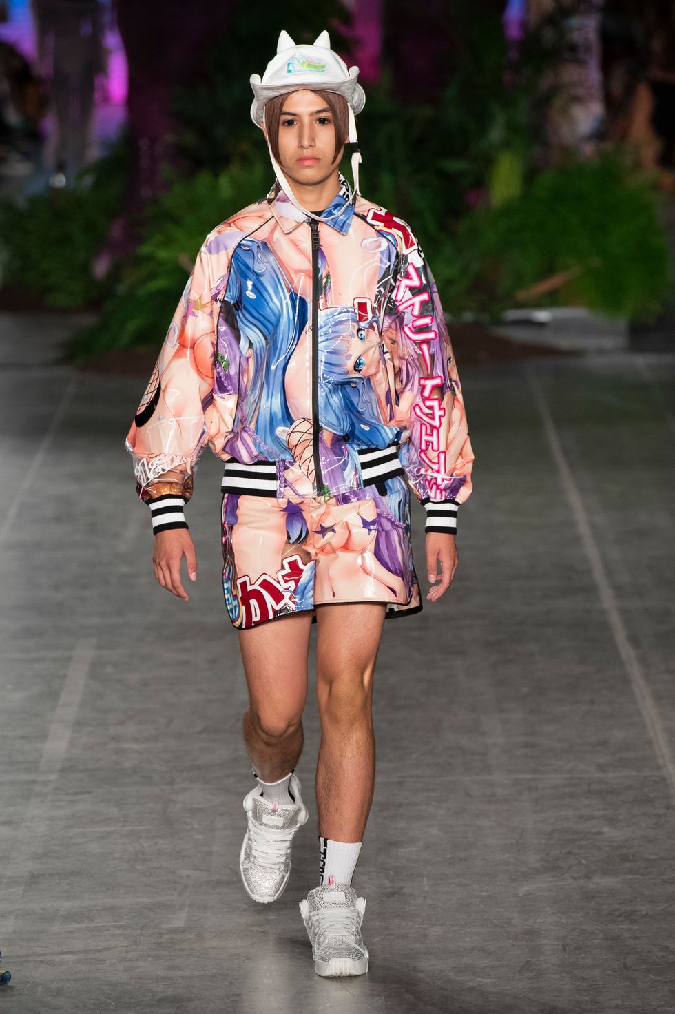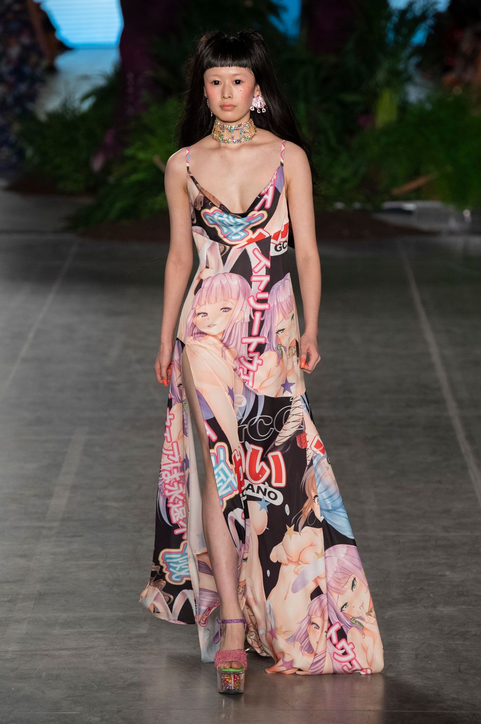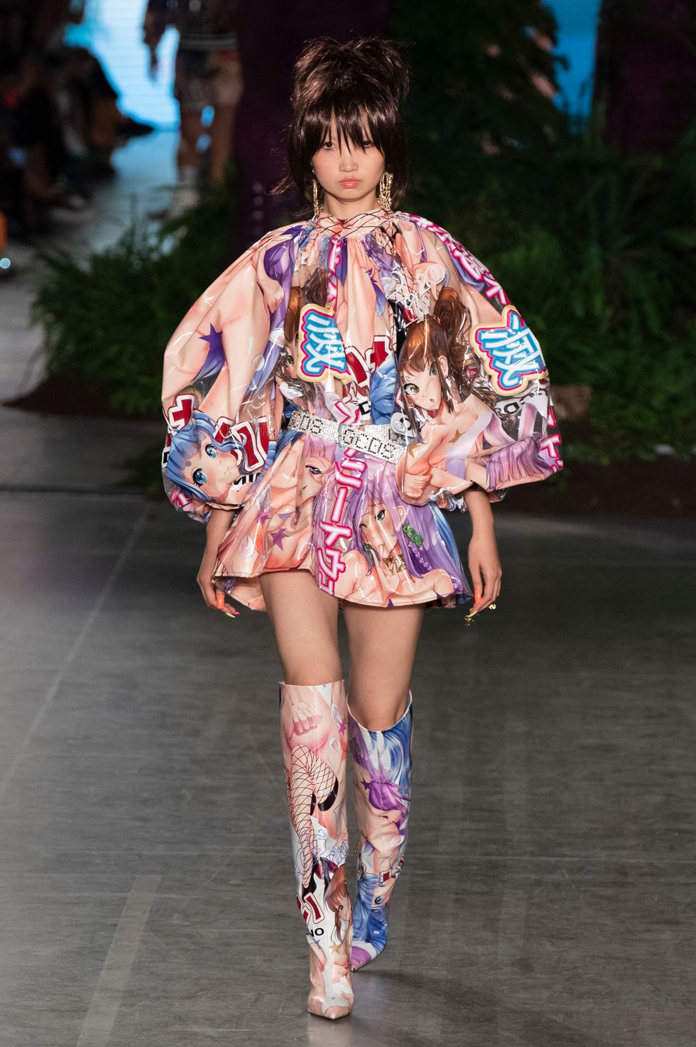 Pieces were rendered in Manga comic book prints all over bomber jackets, boots, and floor-length dresses, which tie in with the Kawaii theme of the show.
