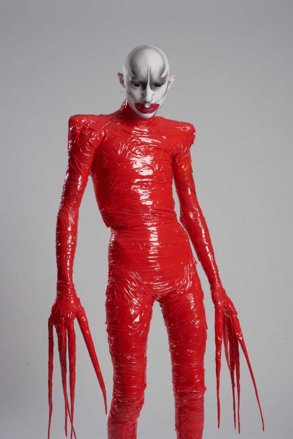 Such pessimism isn’t nihilistic or without action. The 24-year-old emerges from a long, storied line of queer performers who blur the lines of art and activism. At a cursory glance, Marvin’s looks boast a similar kind of campiness as Leigh Bowery, with the terrifying what-the-fuckness of Slender Man. Several photos on Marvin’s Instagram show their use of barbed wire as garb, the prongs pushed deep into their calves and thighs, dangerously close to drawing blood. In another, Marvin’s arms are confined within a garment without arm holes, thrusting to break free. Beauty is pain, an agony parallel to those who are marginalized — trapped and coerced into silence.