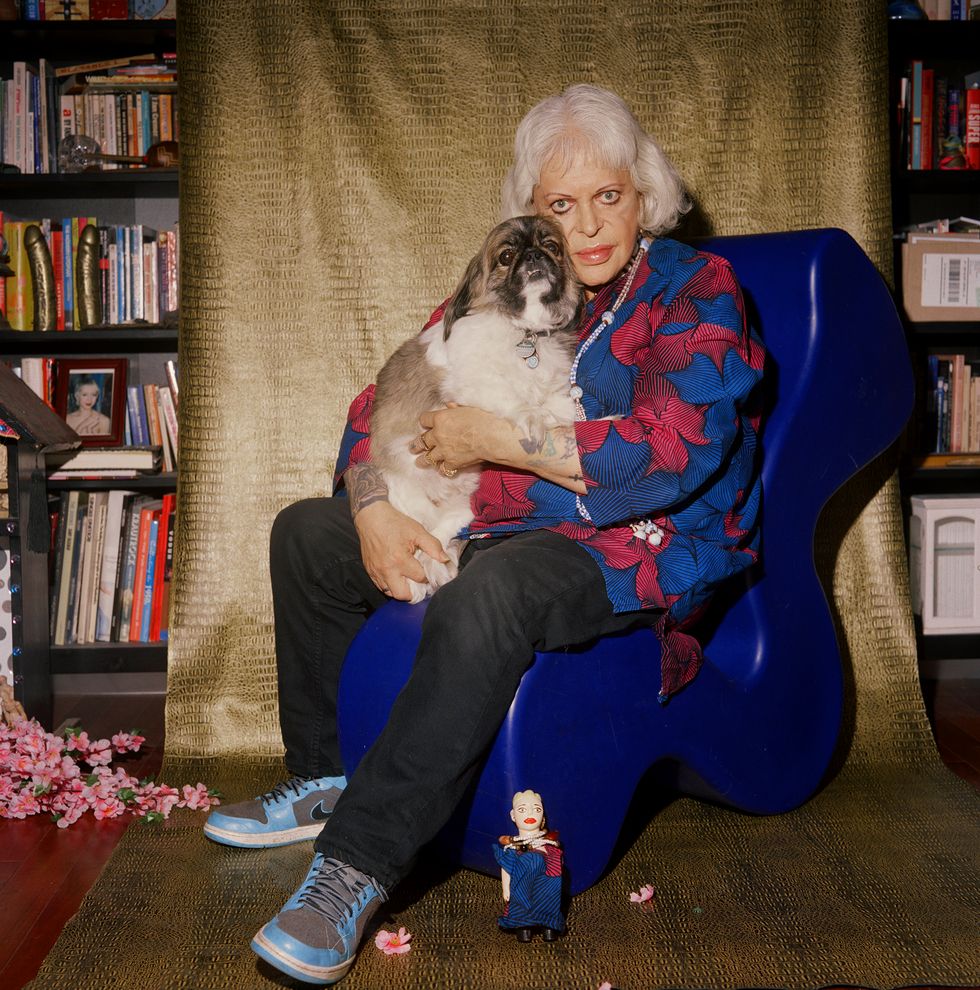 Well into the afternoon, we begin staging a few photos of P-Orridge with he/r monk-like Pekingese dog, Musty Dagger, who once belonged to a member of the Smashing Pumpkins, and was taken in to ease the grief of losing BigBoy, the dog s/he owned with Lady Jaye. Since this interview, Musty Dagger has died, or as P-Orridge would say, "Dropped the body."