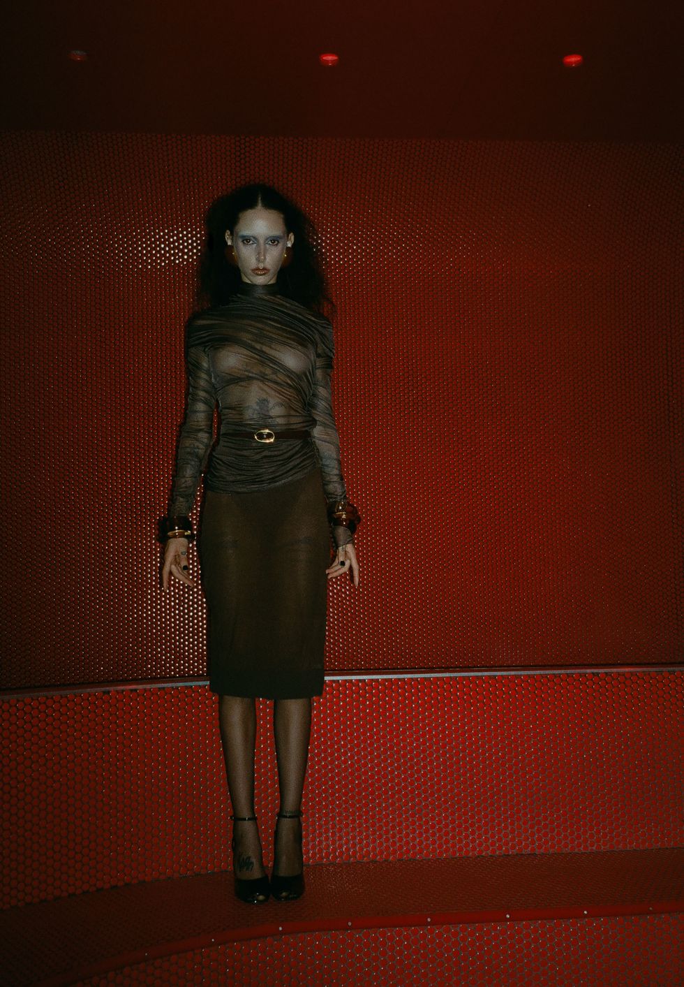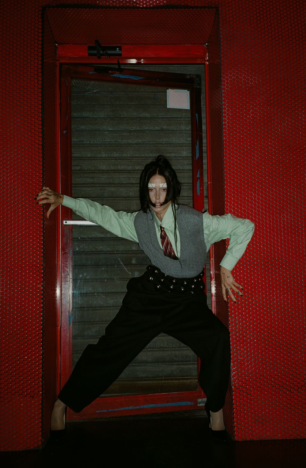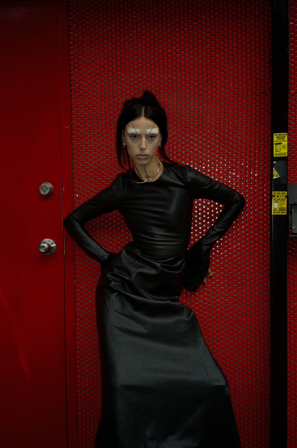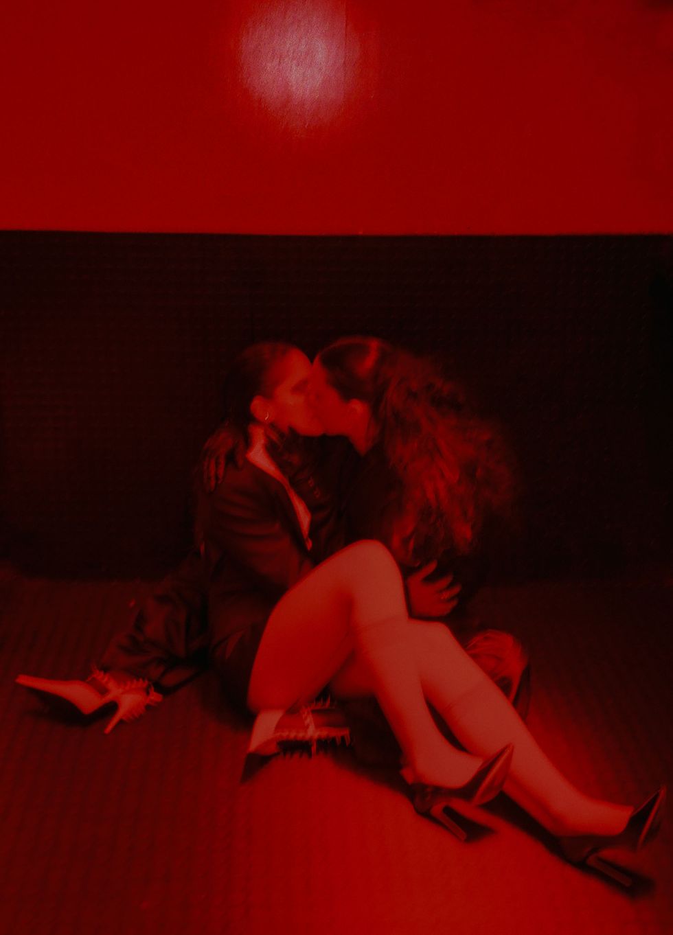 (On Genesis) Suit: Dylan Atwater, Gloves: Soma Faitanin, Shoes: Stylist’s own, Earrings: Lady Grey (On Lucy) Blazer dress: GCDS, Tights: Falke, Shoes: Jimmy Choo, Jewelry: Lady Grey