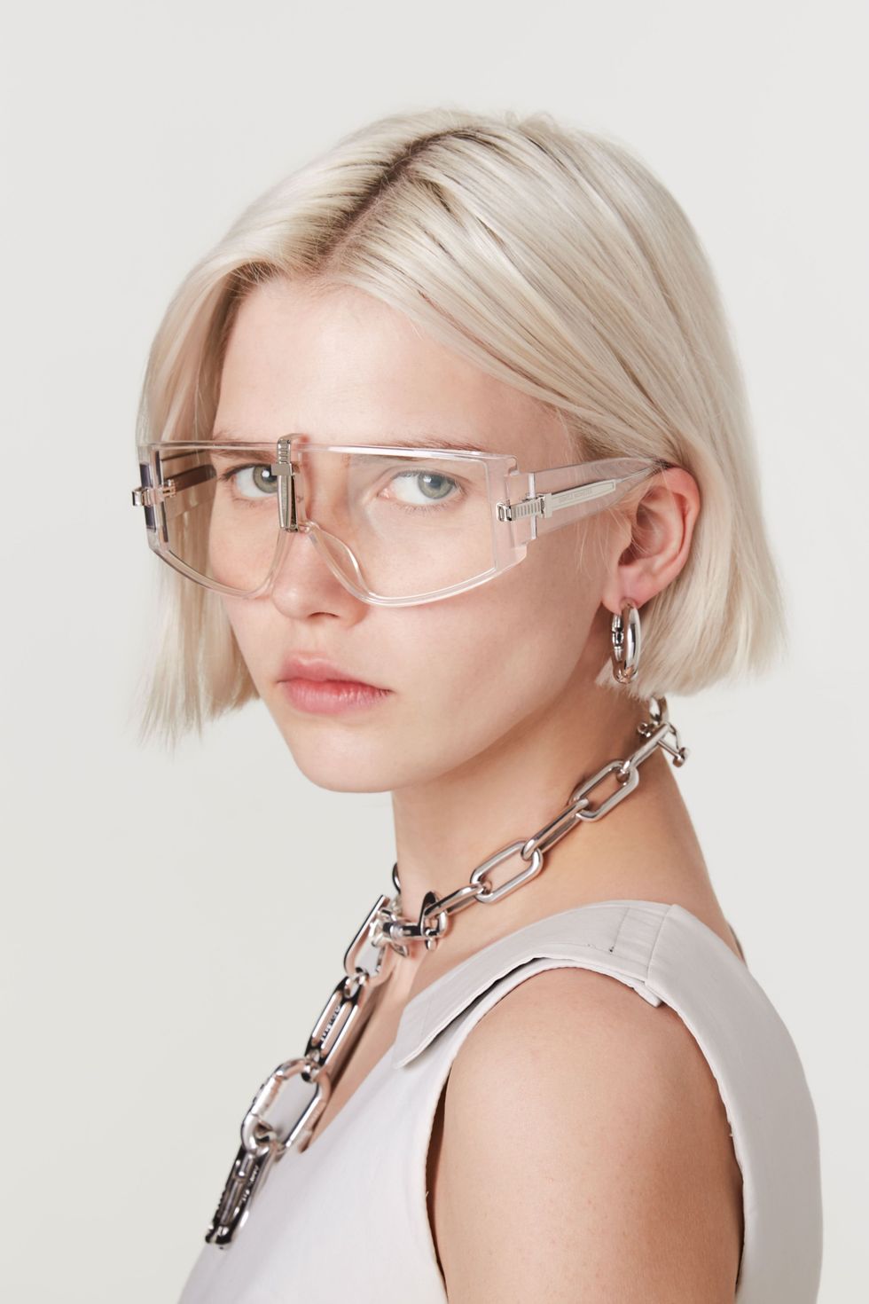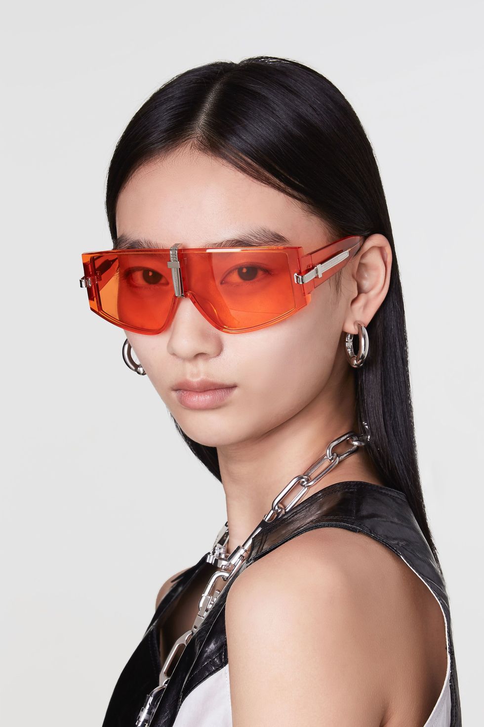 As Ahn said in a press release, "I wanted to create sunglasses to compliment this mood but in a modern 2019 way" — something you can clearly see in the clear, colored frames that resemble sports goggles with cable-ties in the front. Even better? They come in three colors: orange, purple, and clear. Talk about taking sporty chic to the next level.