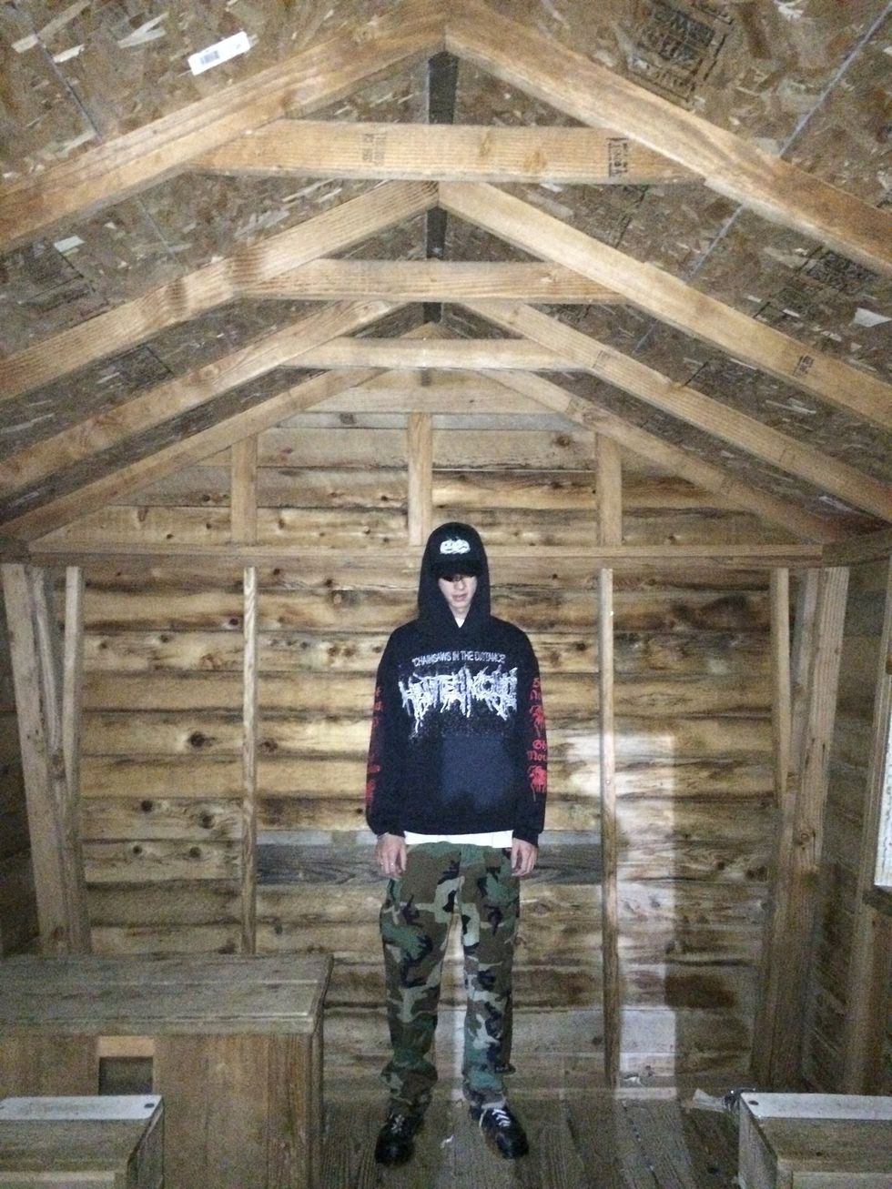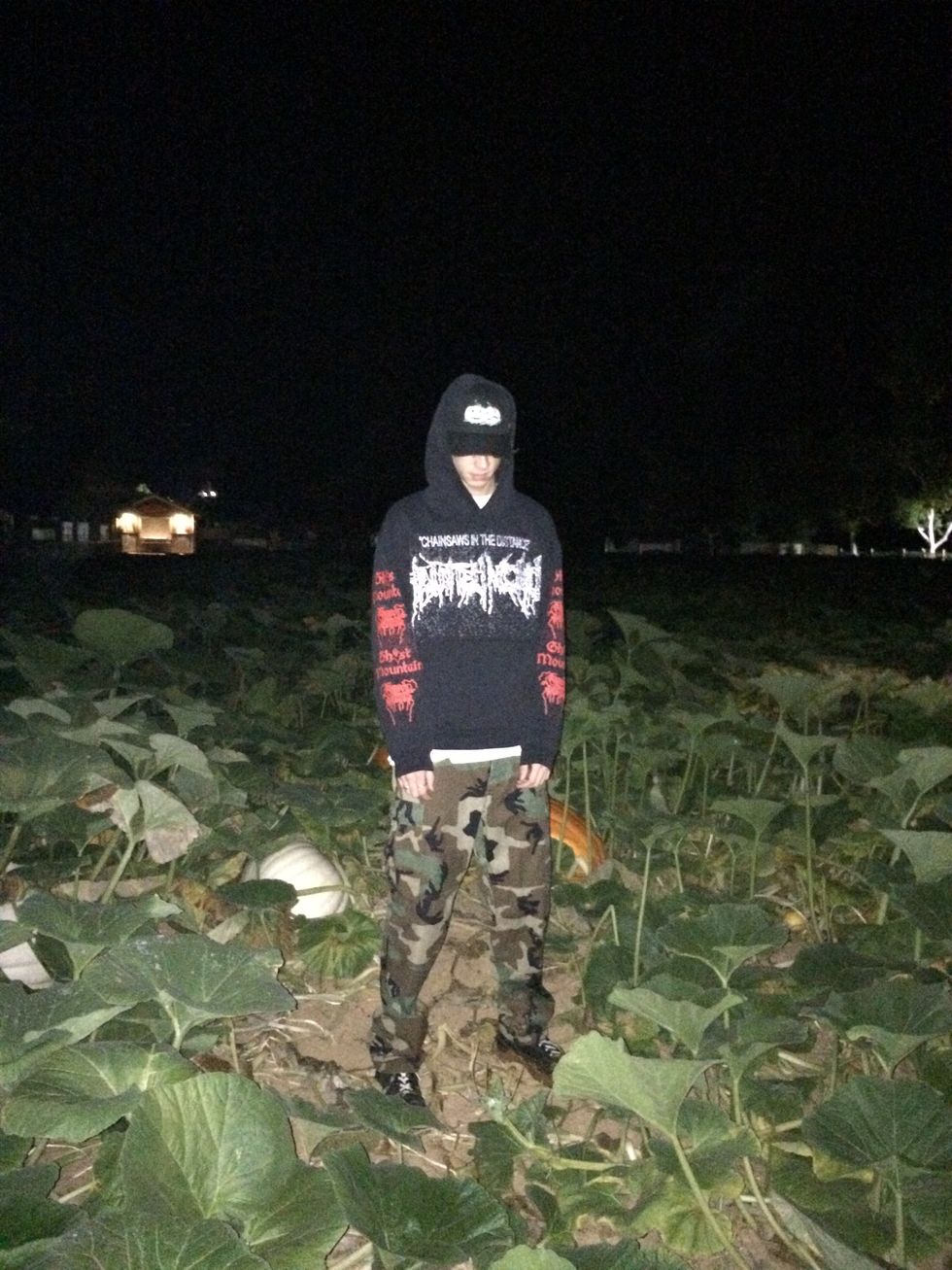 Each piece looks like it could have been salvaged from a haunted house closet — scarecrow sketches, death-cross figures, and Ghost’s own imagery stitched into streetwear silhouettes. A tee splattered with red sketches a stick-figure puppet, while a black longsleeve features skeletal hands and the words “Flayed Out Broken, Left to Die.” Another, “From the Grave,” incorporates a photograph by Eternity Chaos that Ghost calls one of the most personal pieces in the lineup. Together, they read like artifacts from a haunted house reimagined as streetwear.