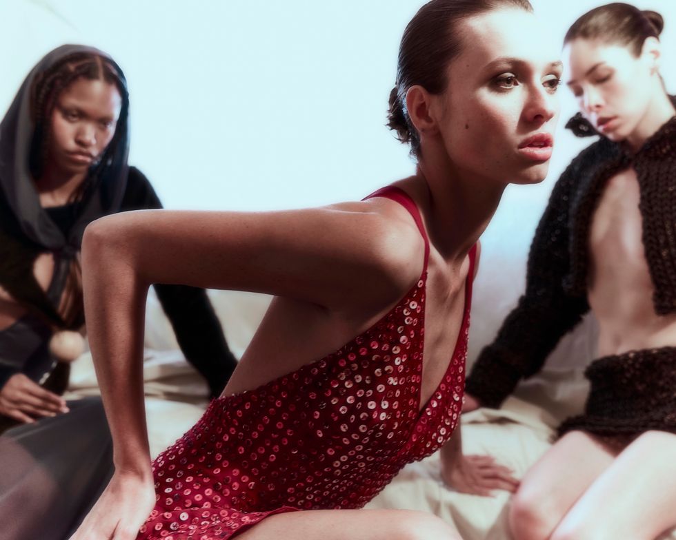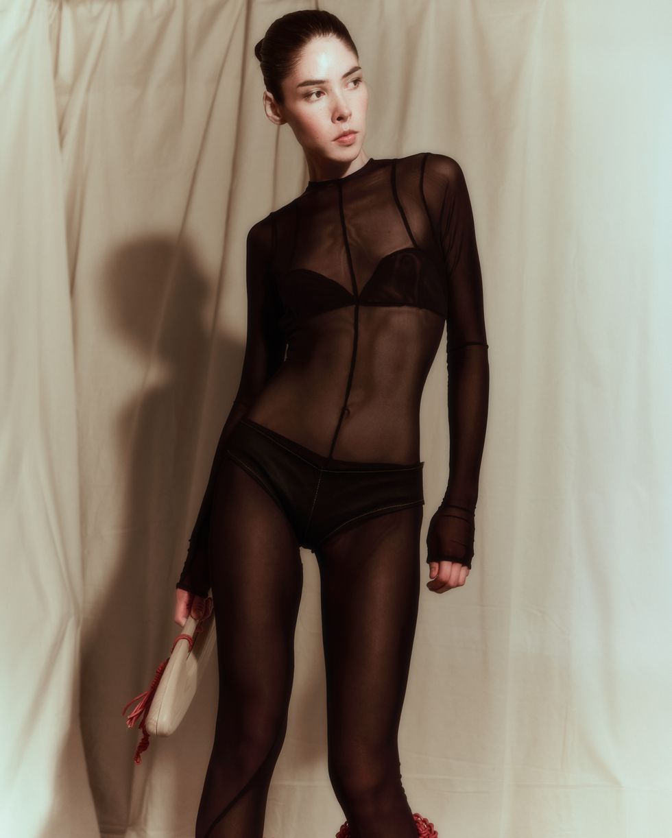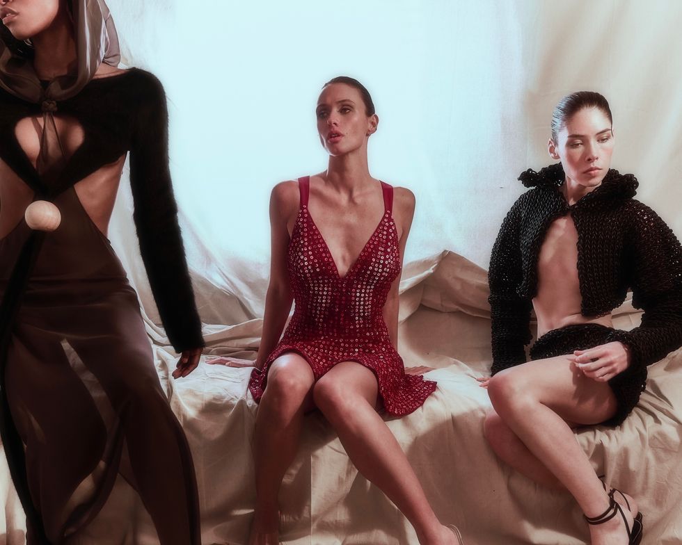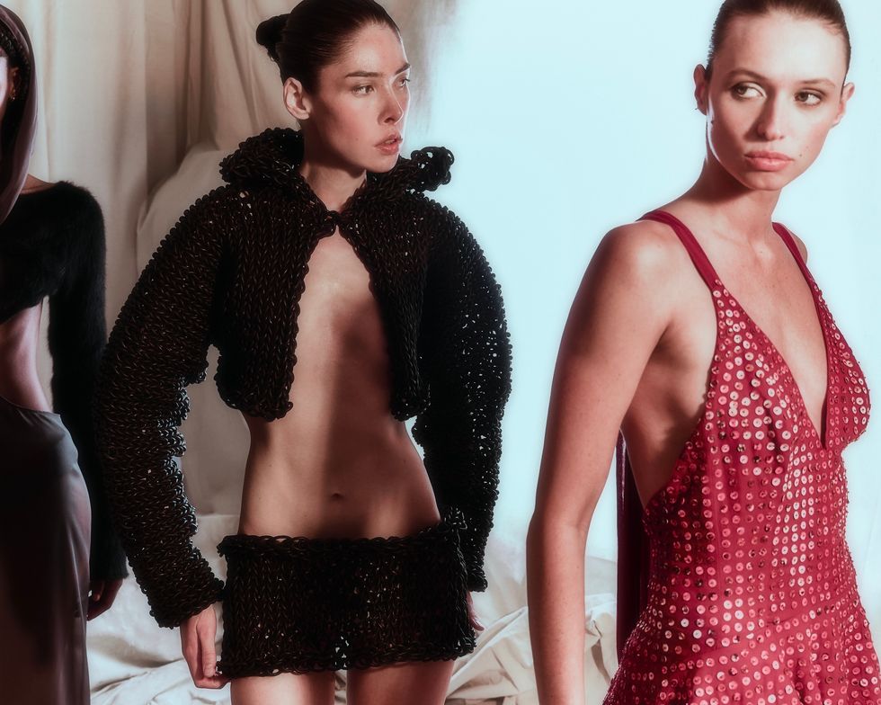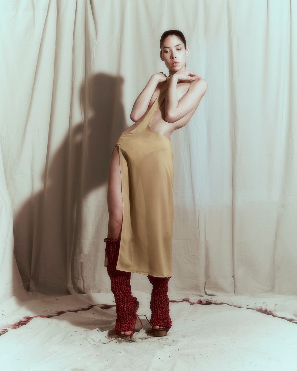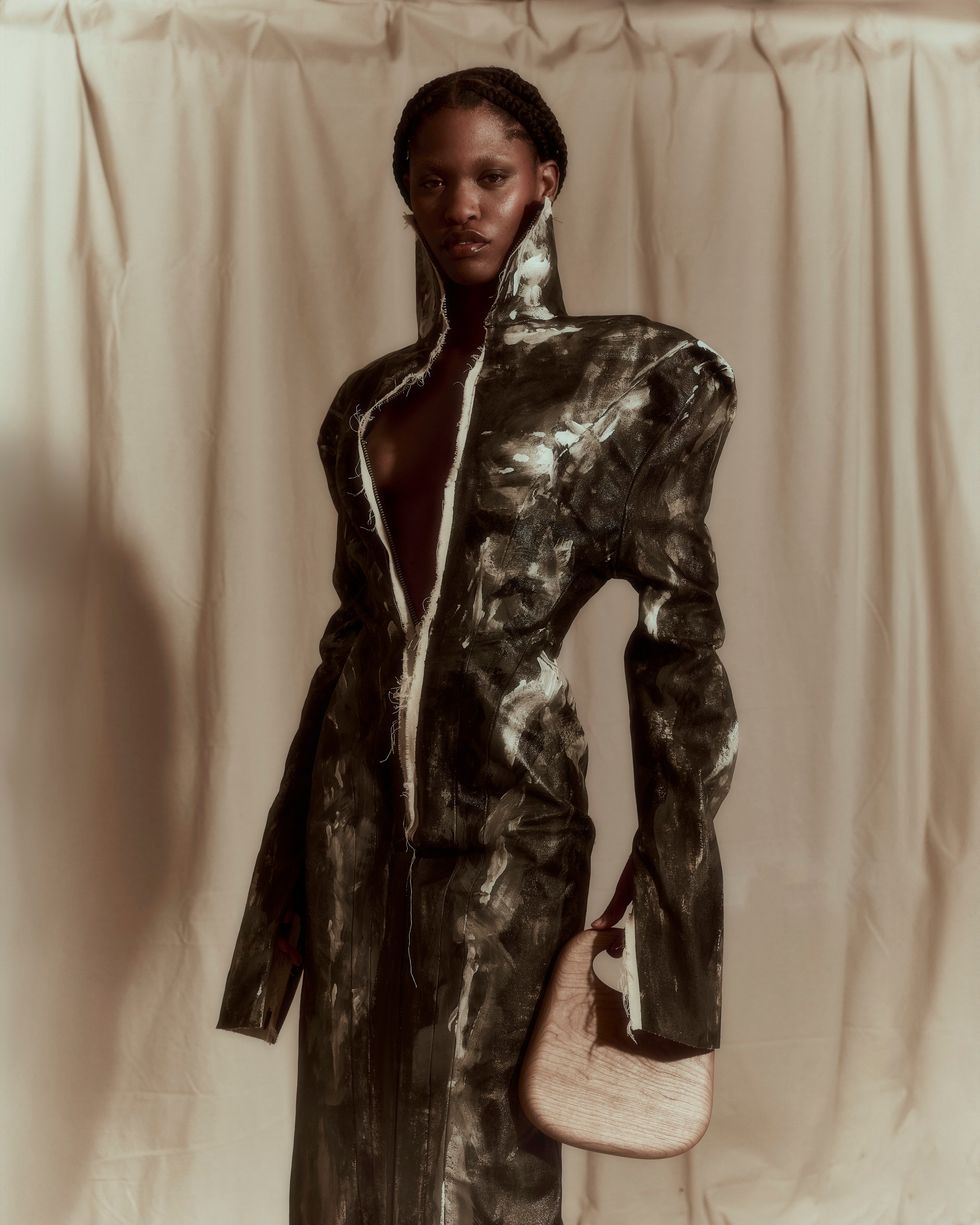 The silhouettes hit like armor: stiff, sharp, structured. But Goode’s process was anything but rigid. She followed her instincts, painting on cheap canvas, mixing house paint with silicone and letting the mess guide the magic. “I knew the girls who wore this shouldn’t have to sit,” she laughs. “The shoes were so severe their knees were buckling. But once you put them on, you just feel it.” It’s not just a collection; it’s a possession. And like any good haunt, it lingers.