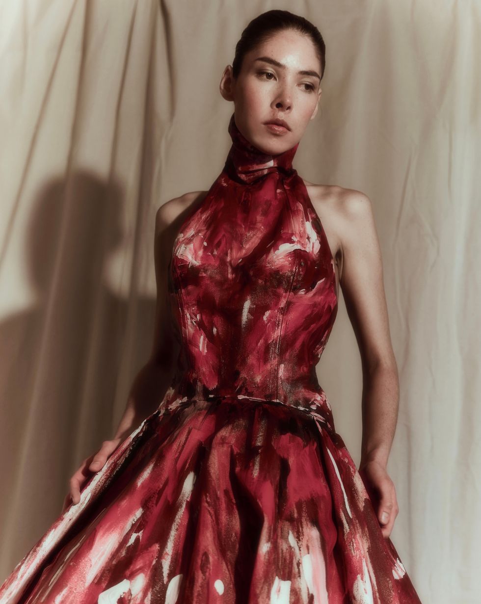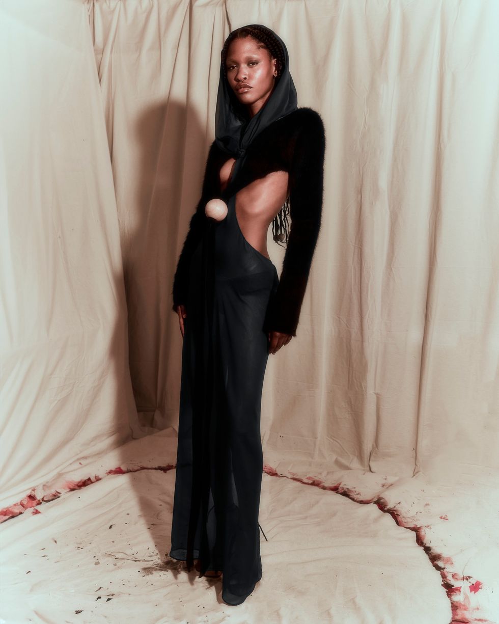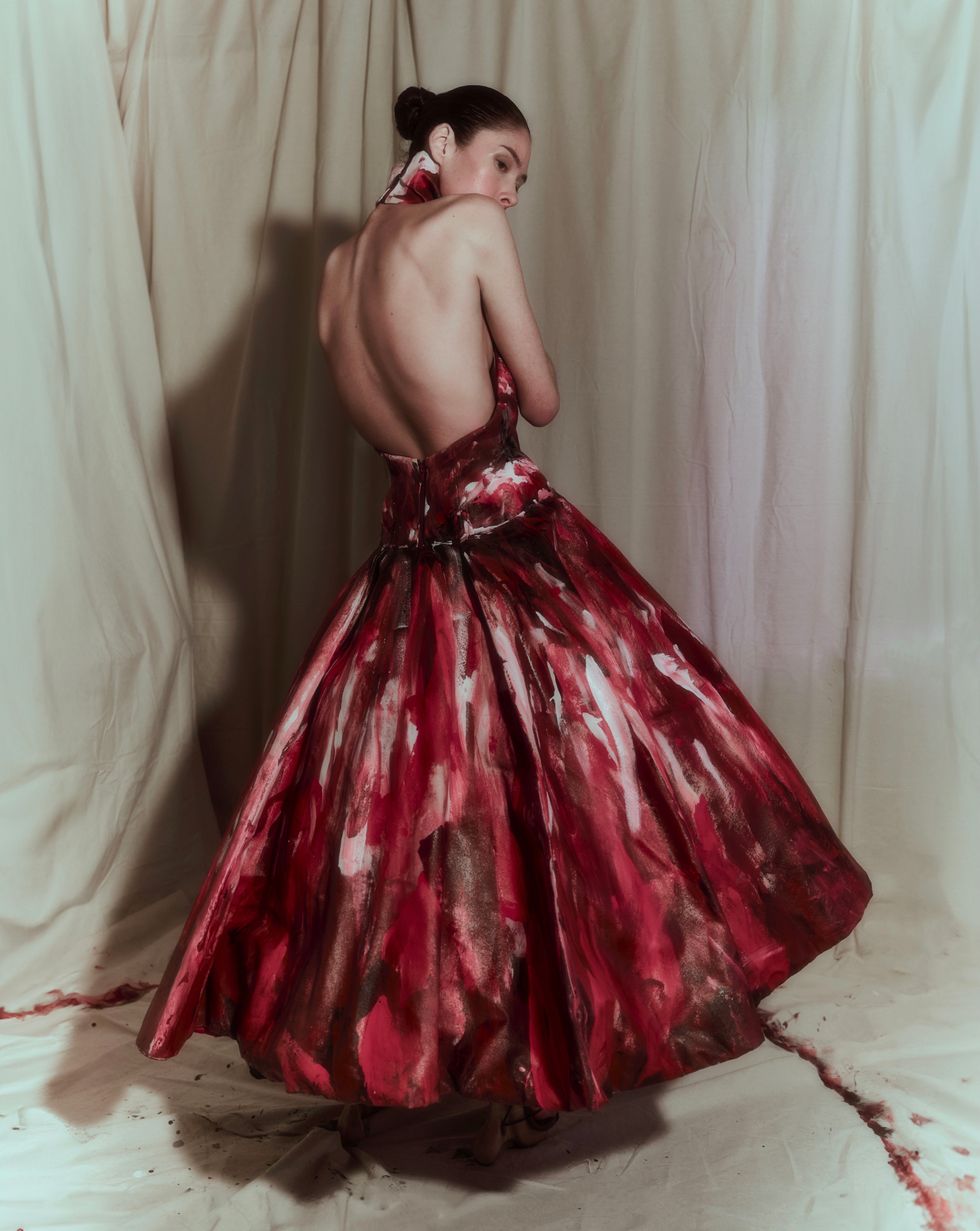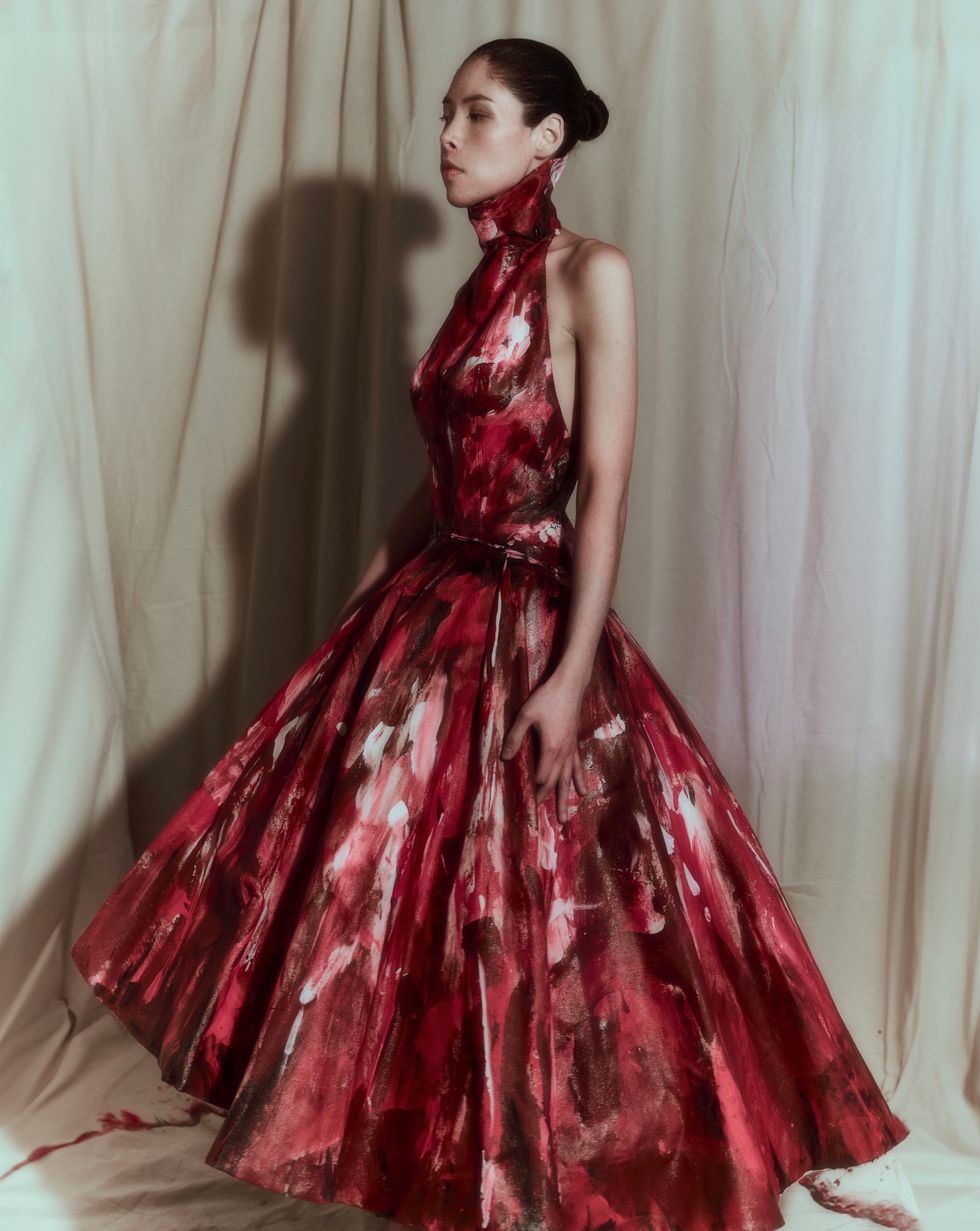 “Hours and hours, even days, just disappear,” she tells me. “Then I open my eyes, and there’s a finished garment, complete destruction around me.” That chaos is baked into the collection. Painted canvas coats with brutal shoulders. Blood-red ball gowns with scorched edges. Jet-black, wet-look hoods that drape like post-apocalyptic nun habits. If her first collection was made for the red carpet, this one is made for a wasteland — with a side of Paris Fashion Week. “I imagine a sort of film,” she says, “like a dystopian, high-fashion, maybe less hot Dune-type film. Post-apocalyptic, mysterious creatures, but the girls still serve."