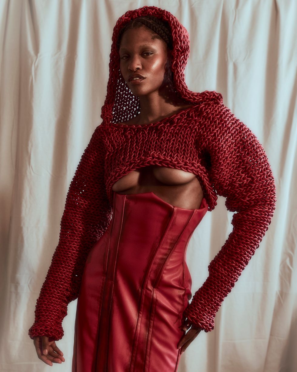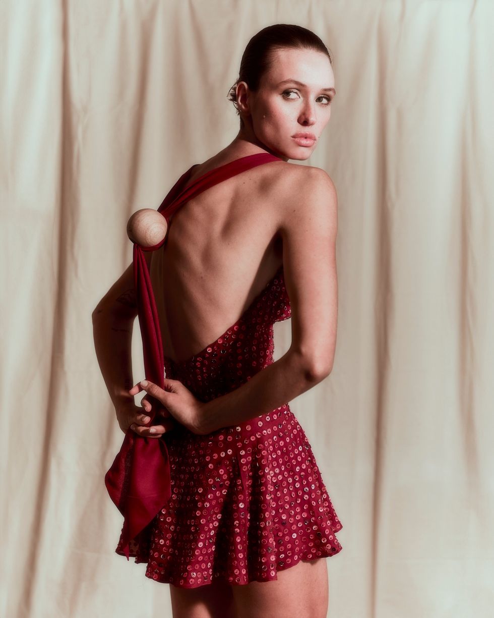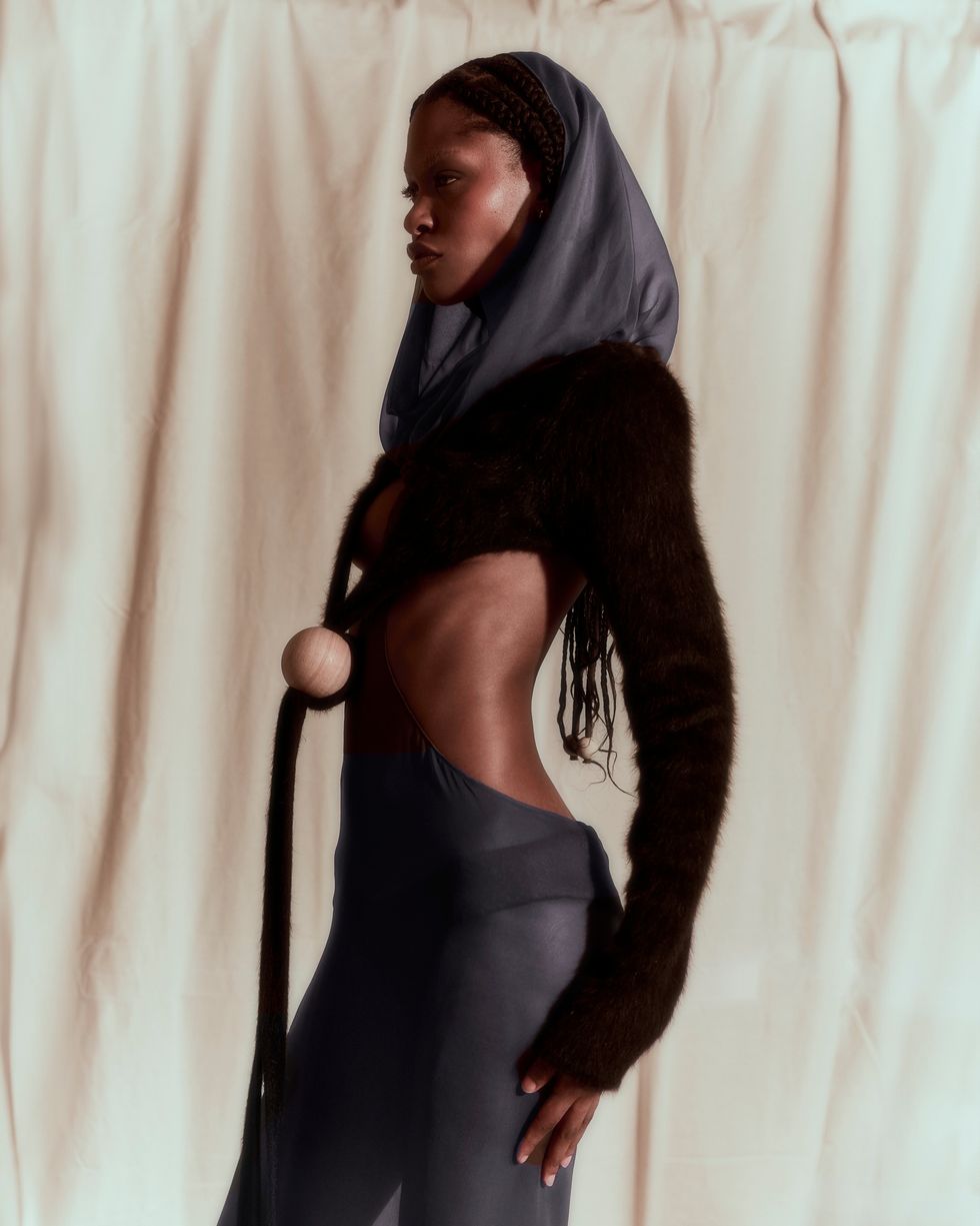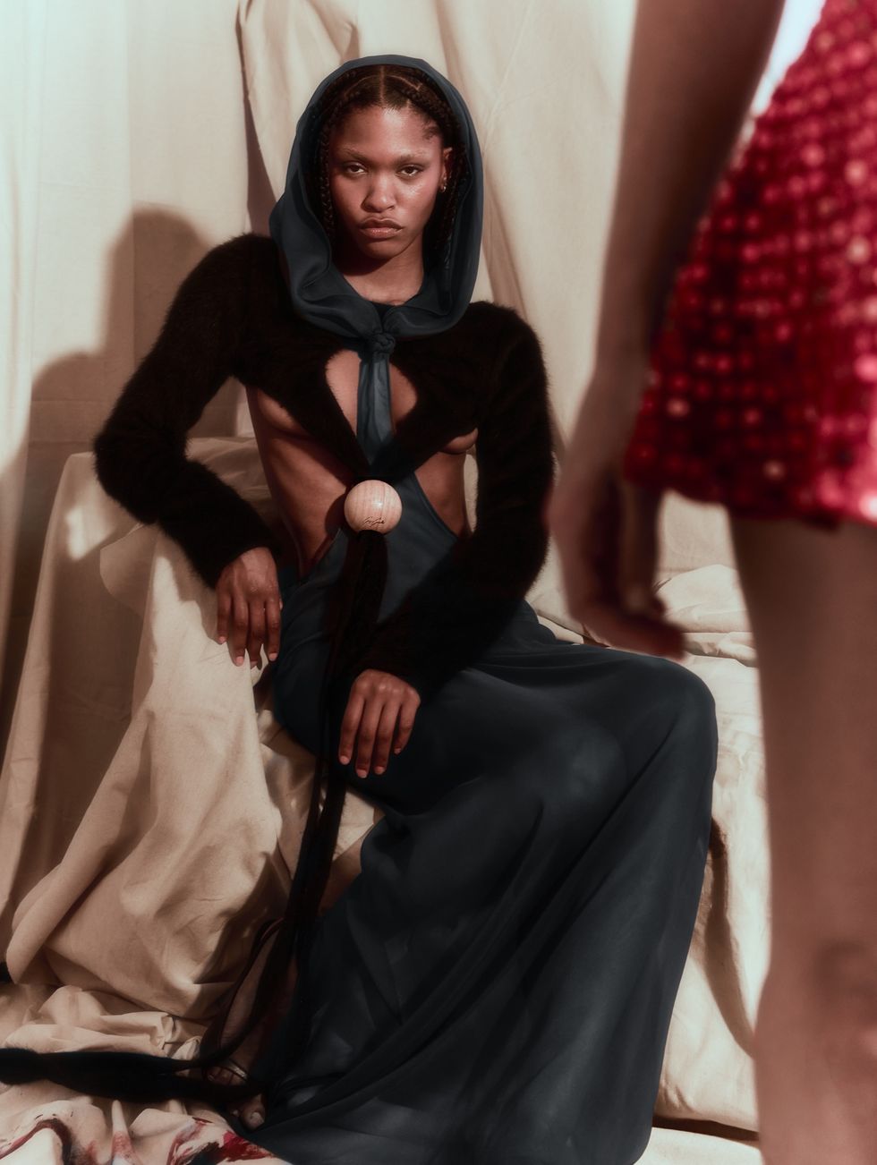 “Hours and hours, even days, just disappear,” she tells me. “Then I open my eyes, and there’s a finished garment, complete destruction around me.” That chaos is baked into the collection. Painted canvas coats with brutal shoulders. Blood-red ball gowns with scorched edges. Jet-black, wet-look hoods that drape like post-apocalyptic nun habits. If her first collection was made for the red carpet, this one is made for a wasteland — with a side of Paris Fashion Week. “I imagine a sort of film,” she says, “like a dystopian, high-fashion, maybe less hot Dune-type film. Post-apocalyptic, mysterious creatures, but the girls still serve."