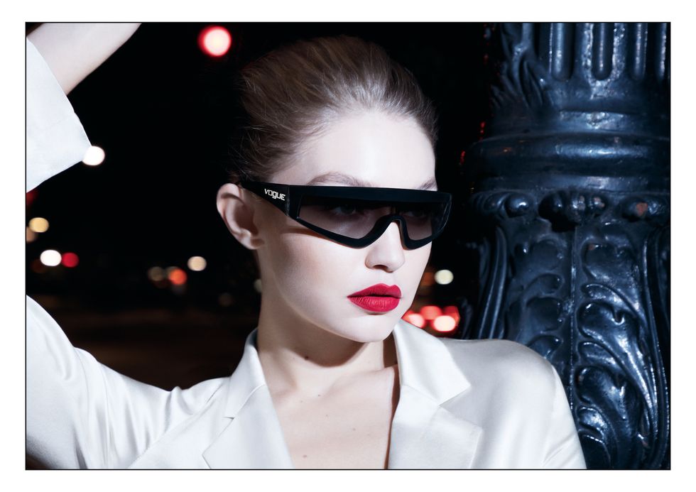 Hadid brought this protective armor-like feeling to her line, favoring shield-style frames and tinted lenses, and several models in the collection (Soho, Lafayette and 23rd St) were named after favorite neighborhoods in New York City, where she lives. "There is an emotional connection for me with glasses, too, which is interesting," she says. "When I put on glasses in the morning, I feel as though that can bring something out in me that makes me feel more confident about going through the day. I think everyone needs that sometimes."
