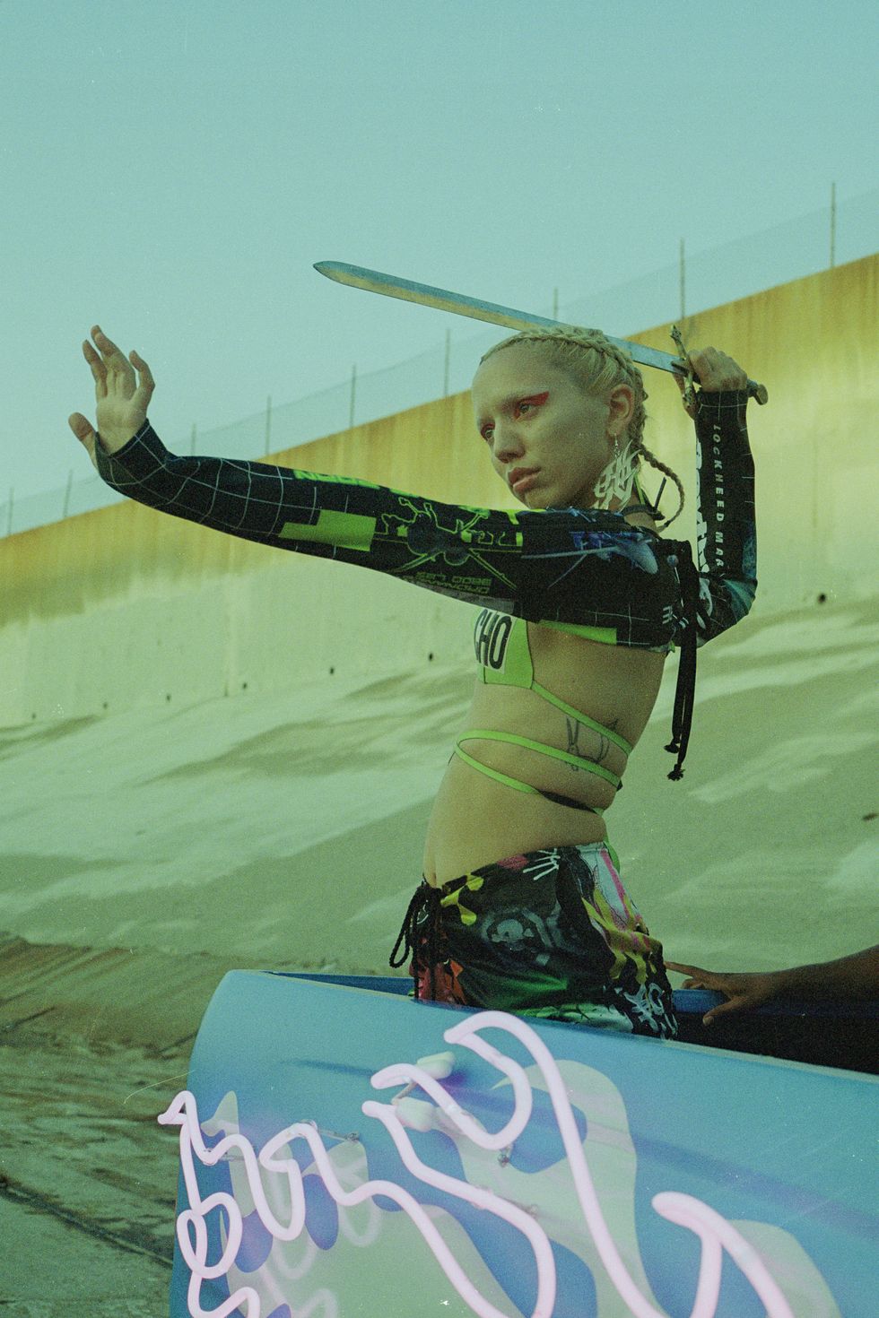 I conceptualized, designed and built this piece by essentially renovating my overused work truck into a glowed up sculpture. I worked alongside my brother and our collective (IM-CREATIONS) comprised of local LA artisans to make these modifications. This truck went through a massive transformation — from rotten green with a washed out tan interior to the leveled up "Cabroncita". The totality of this final cinematic piece is a collective work made with fellow artists who shared their talents to create this multimedia experience.Tell me about the "Psycho" bikini and "RIP Misogyny" boots.