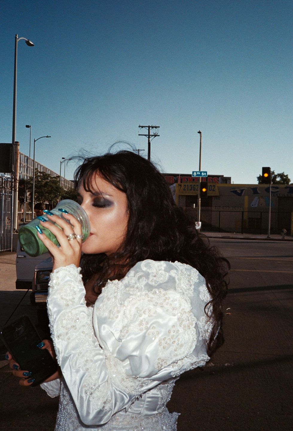 The single arrives alongside a Cole Santiago-directed music video that dramatizes this sentiment. Playing the part of a runaway bride dipping out on her wedding day, the video sees Girl Ultra absconding with a spiky-haired punk on the streets of LA, spitting out rose petals and getting cozy in the backseat of a cab. The whole thing is drenched in a dusty layer of melodrama with its relaxed vibe and 16mm film filter.