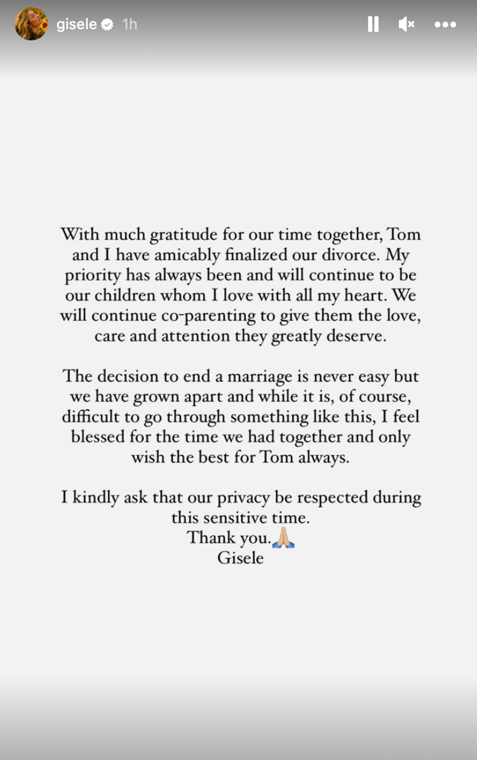 "With much gratitude for our time together, Tom and I have amicably finalized our divorce," the statement reads. "My priority has always been and will continue to be our children whom I love with all my heart. We will continue co-parenting to give them the love, care and attention they greatly deserve."