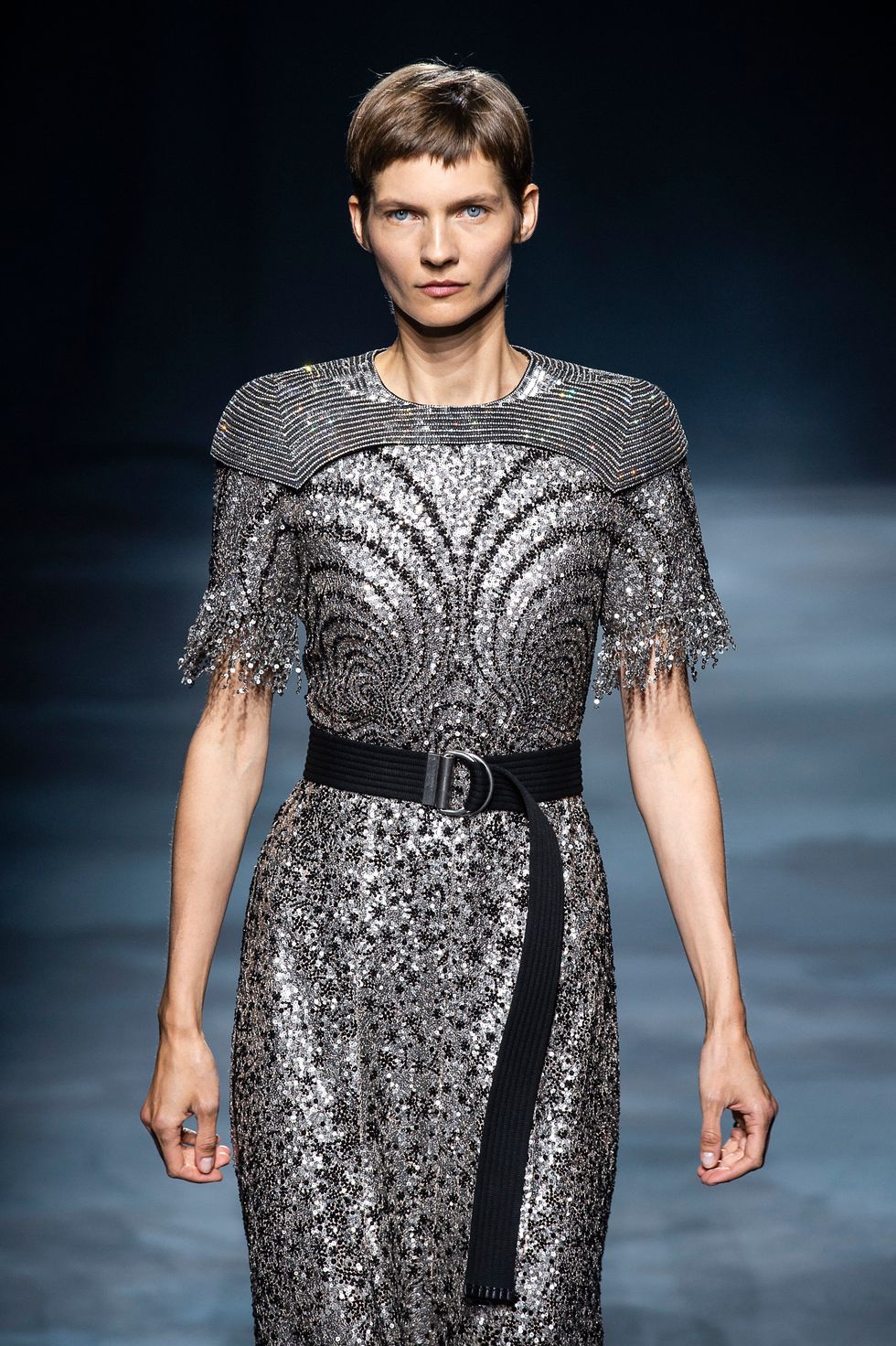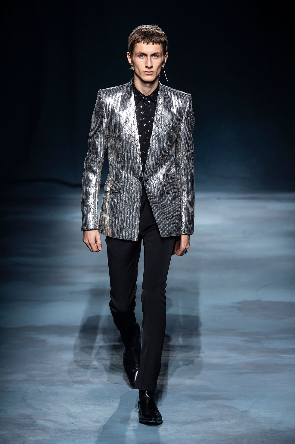 On a few choice garments, intricate silver beading ran wild across blazers and trousers. As they glimmered and glided down the runway, they made the men fitted into them look as if they were Oz's Tin Men, revived and searching for their hearts at a 1OAK VIP table.