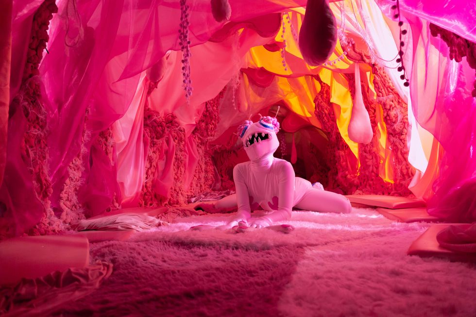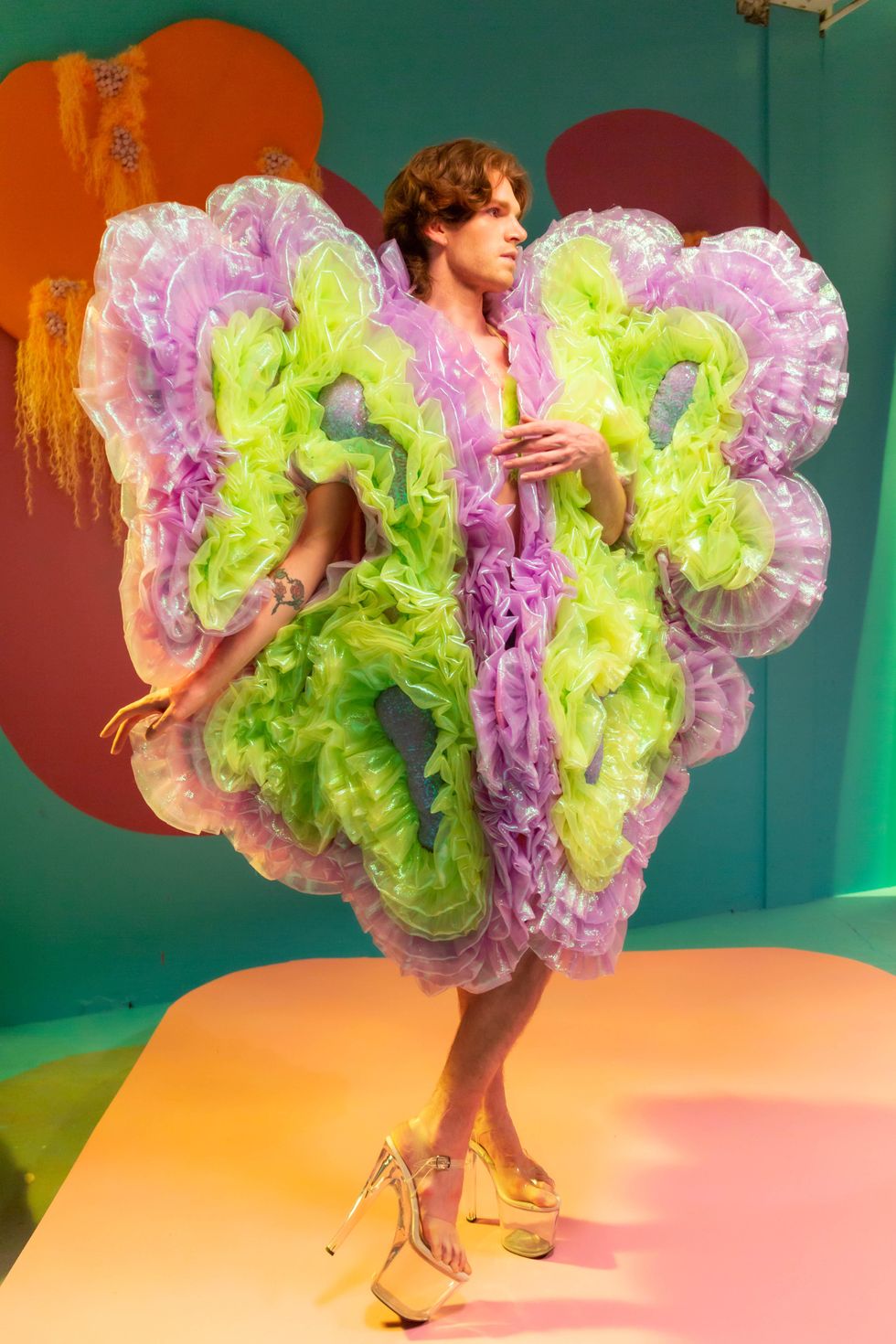 Like a twisted episode of Teletubbies, where PBS Kids meets poppers, the fashion film continues to unfold as a queer life lesson. We watch the creature sheepishly learn from these mentors — on stripper poles, in corsets and giving full faces of makeup — until it finally joins in on the chosen family fun.