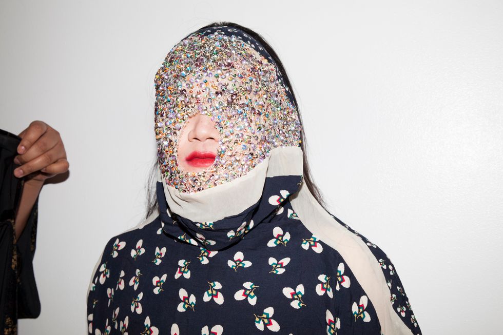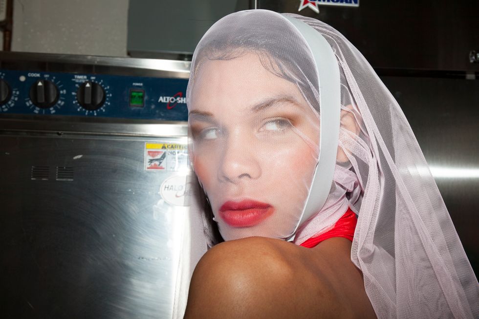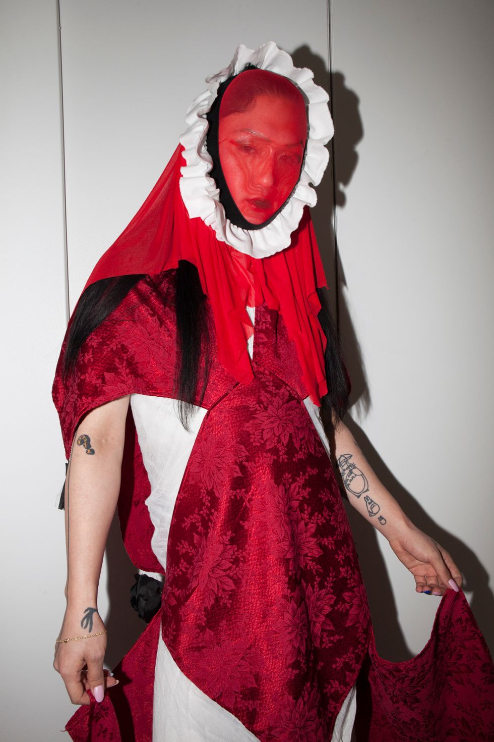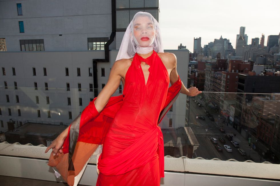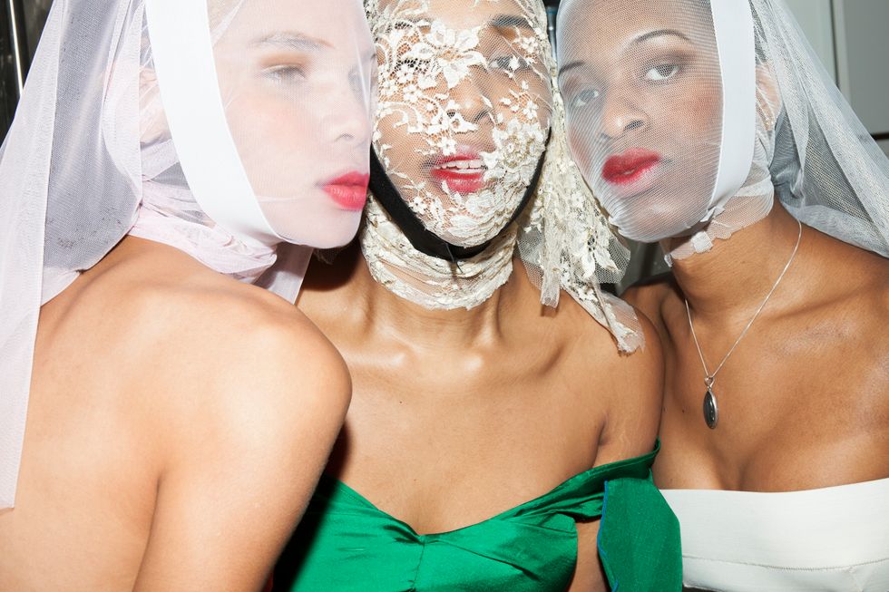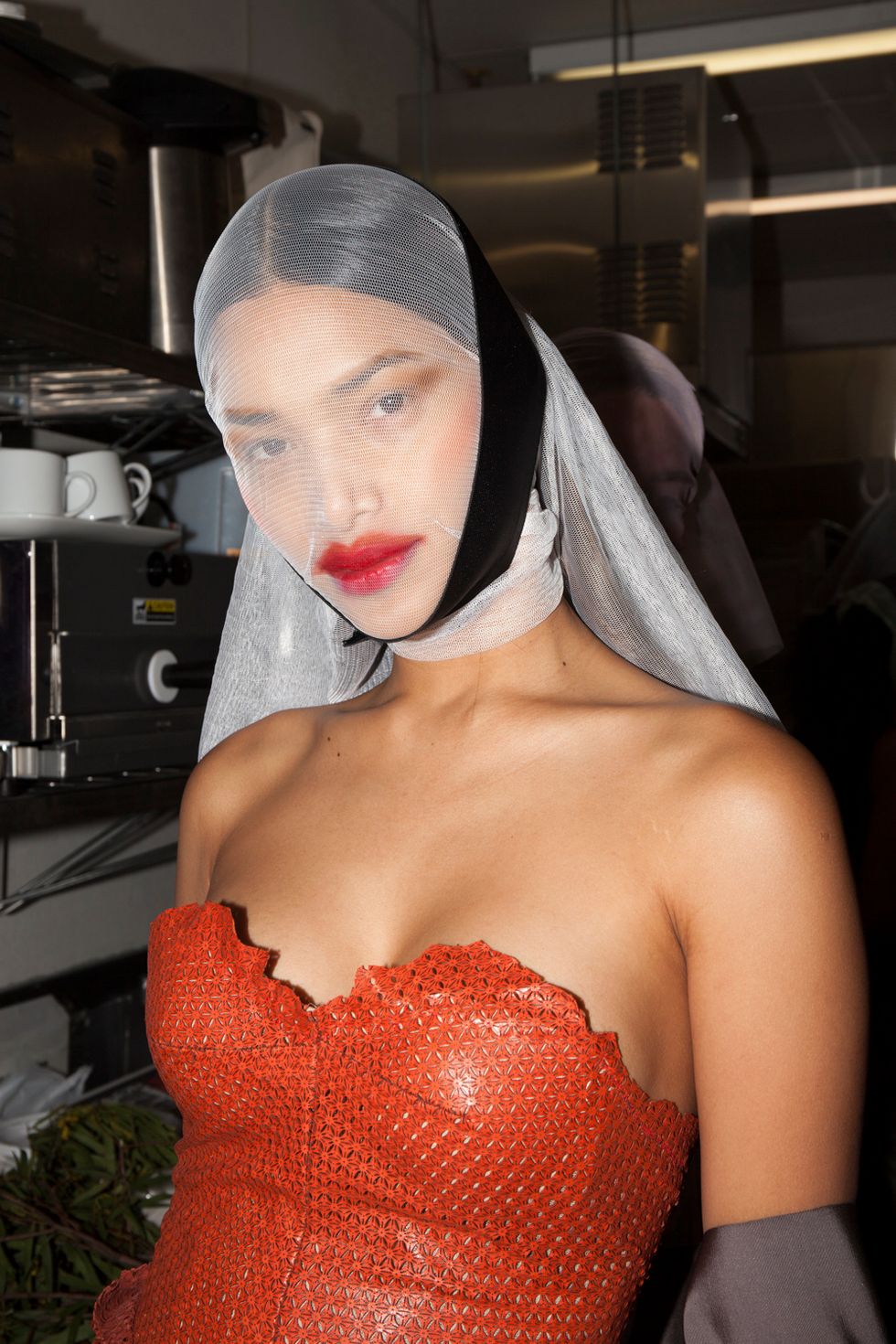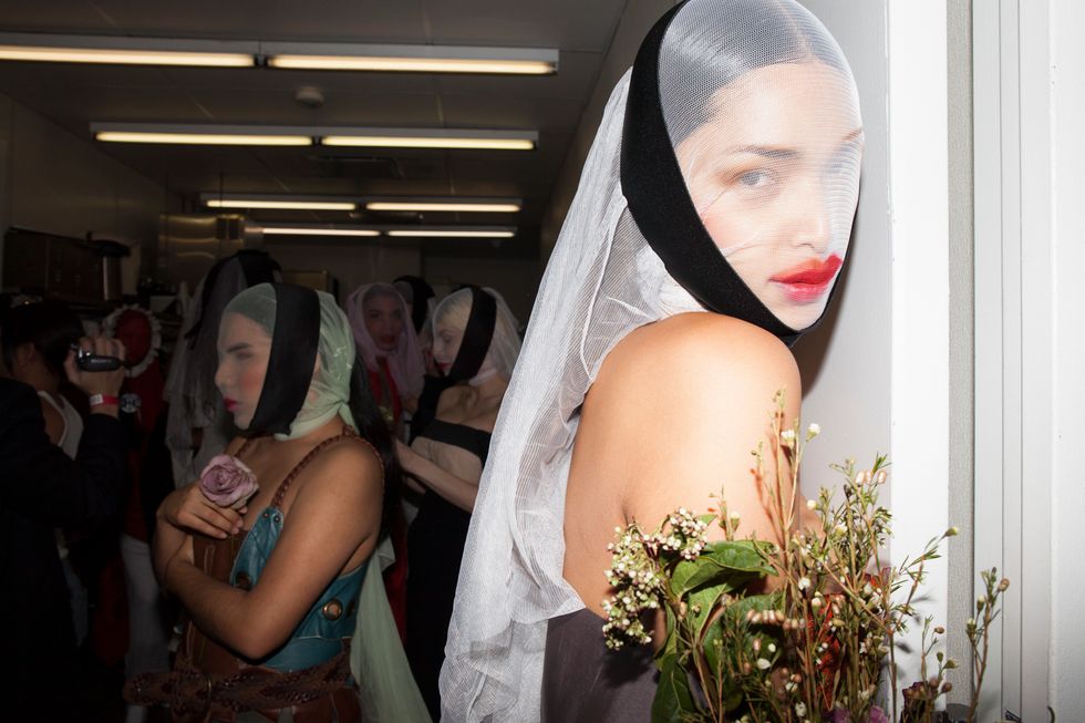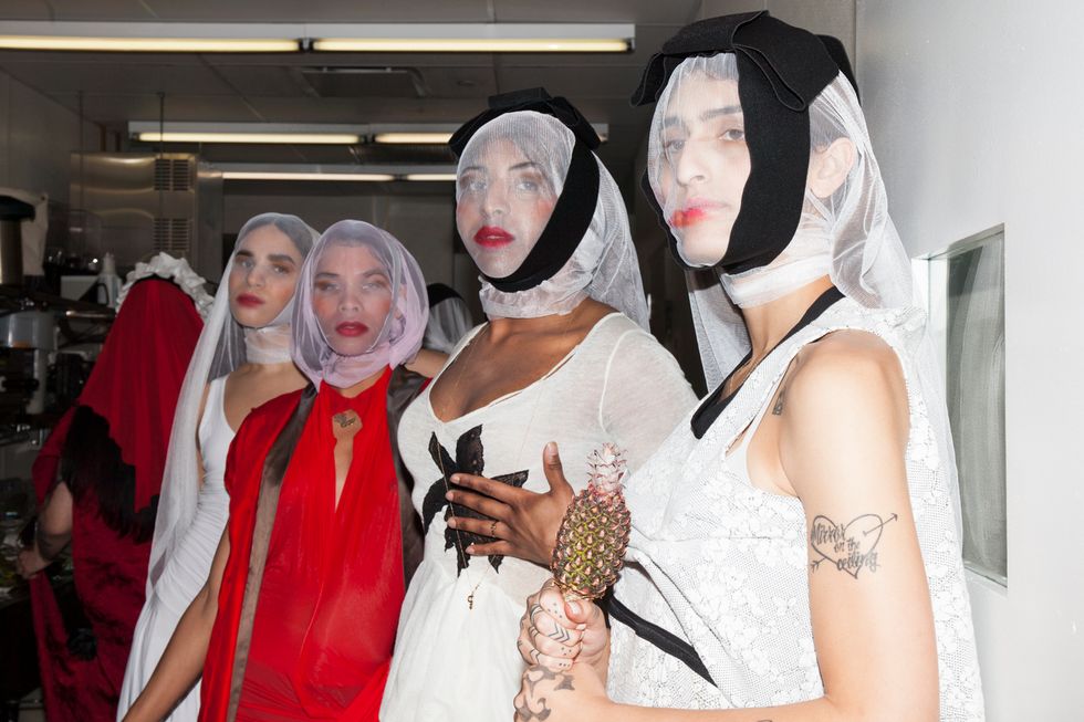 Graham has been working somewhere between the art and fashion spaces for several seasons now, but this presentation felt like something of a breakthrough. This season, the designer, who makes work which specifically celebrates the trans female body, showed dramatic, sirenic gowns with matching head coverings. I thought they were wedding dresses, but that wasn't quite it. "I was thinking a lot about garments someone could wear to be married in or be buried in," Graham said after the show. "It's ceremonial."